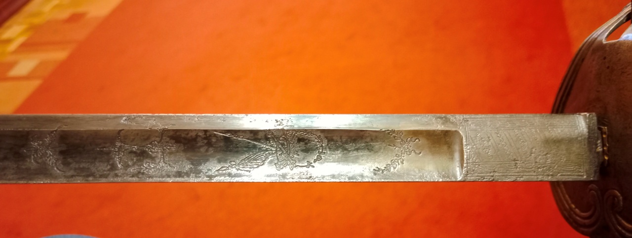 I will back you up that Solingen blade decoration is instantly recognizable. As an example the photo below shows similar decoration on a British 1796 heavy cavalry officers undress sword with a Runkel blade (left) and a French Heavy cavalry officer guarde de bataille sword with a blade marked ISB. Cheers, Bryce |