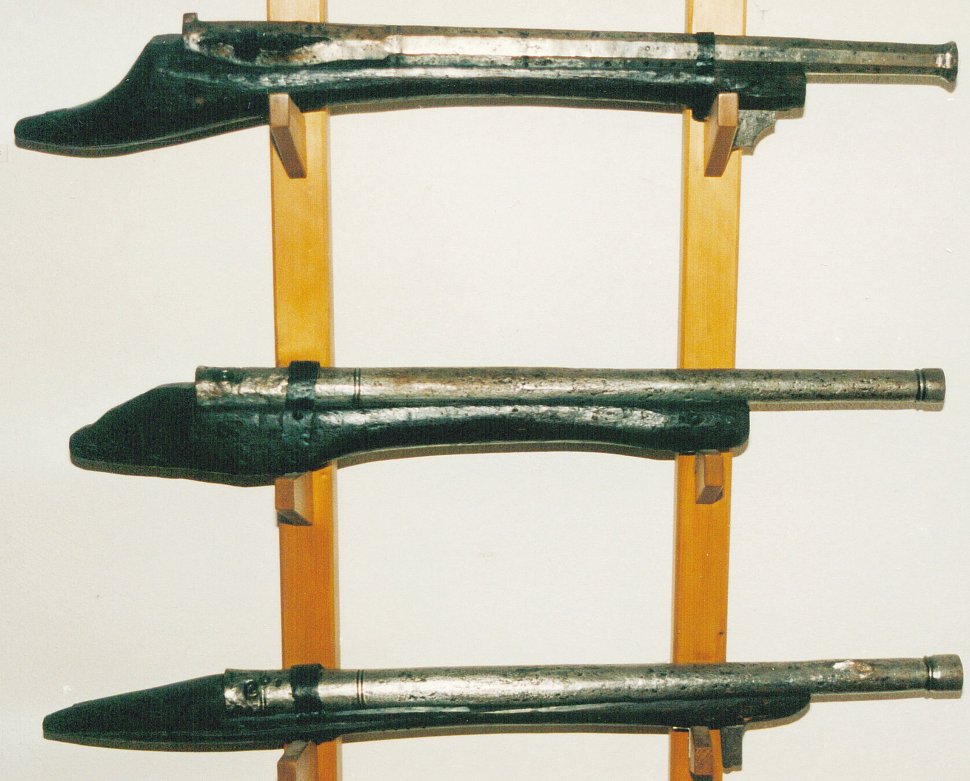 In the Bavarian Army Museum Ingolstadt are three crude but nevertheless interesting arquebuses (from Schrobenhausen, a town nearby) preserved that much resemble the one illustrated in Auch cathedral (see images above).