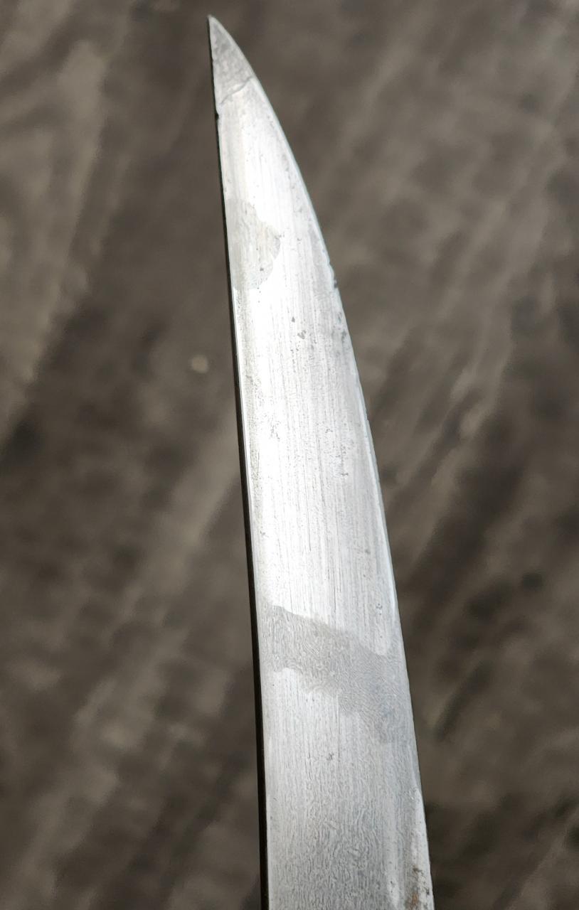 I picked up a nondescriptly named "curved sword" at an auction recently and may have done alright for myself despite my initial disappointment at the blade. From the auction photo I could see some form of calligraphy on the blade but not much else. The grip looks almost like one of the "modernized military Khyber knife" grips I've seen on some sabers from areas around and in Afghanistan. When I got the sword, there was no visible wootz, just some oddly twinkling crystalline dots amid the rust. The cartouche seemed promising though so I went ahead and cleaned a portion of the blade and did a minor test etch (please don't judge the etch I'm still figuring that part out hahaha). My progress so far showed most of my initial worries were unfounded. I'd love to hear y'all's thoughts. I'll post an update when I can manage a respectable etching. The cartouche has a "172" at the bottom of it. Assuming the rest of the inscription is fiction, I'm assuming that might point to a Gregorian 1759 manufacturing date for the blade?