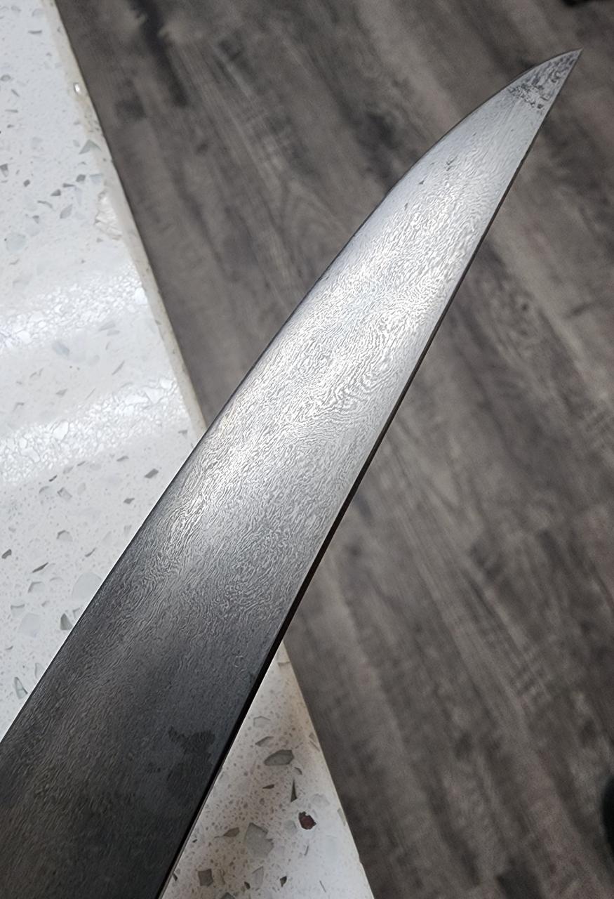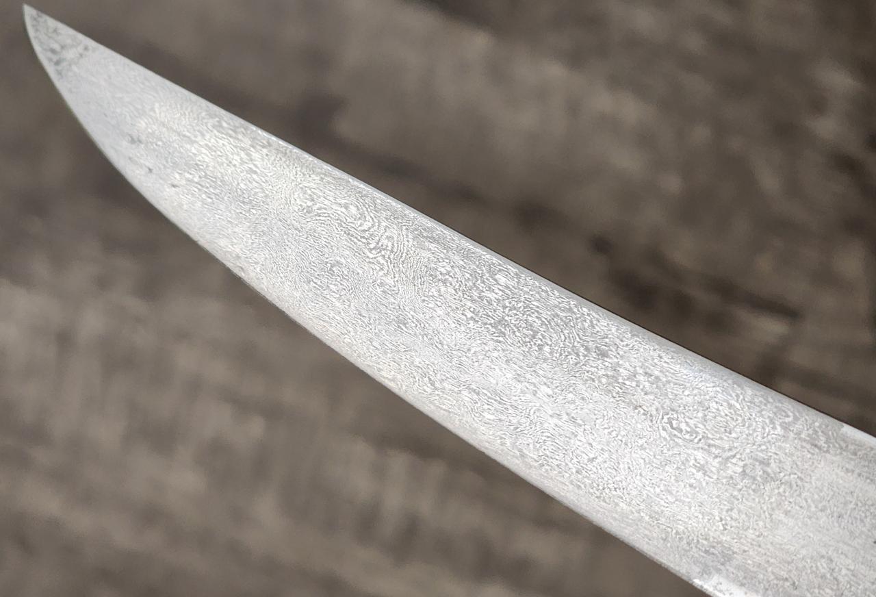 I managed a marginally better etching with the Ferric Chloride. It does look more like wootz towards the edge now but gets less so towards the spine. Almost like it was heat treated composed of multiple steels. |
