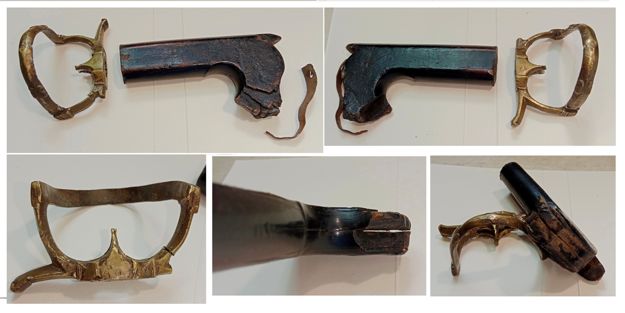 The brass is broken, with hammer marks. The hole in the hilt is too big and someone tried to fit it with a hammer. The hilt must have been from another sabre. The handle, made of rhino horn, is chipped and cracked. It crumbles easily. If these parts were in better condition I would certainly not have reworked this sabre. Attachment 239829 |