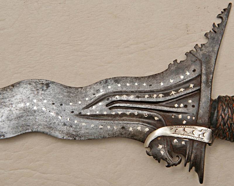 Thanks for bringing this up again! Could you share some examples of Indian blades which you refer to as kris/keris-like? It's certainly a matter of definition but I have yet to see an Indian example (either extant or recognizable from artwork) which could convincingly argued to be a direct ancestor of the Southeast Asian keris. I have no problems to believe that the idea of wavy blades got carried with Hindu culture to SE Asia but early keris seem to have straight blades... Also there are quite a few swords with flaring out bases vaguely resembling the gonjo in keris. However, I have yet to see an asymmetrical (not to mention separately forged) gonjo in Indian blades. Moreover, this broad base is part of the hilt rather than the blade which makes for a very different production process. So while I can see some similarities I'm far from convinced that these Indian pieces are really related to keris. Regards, Kai |