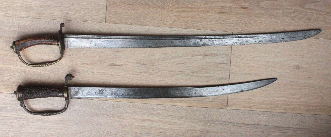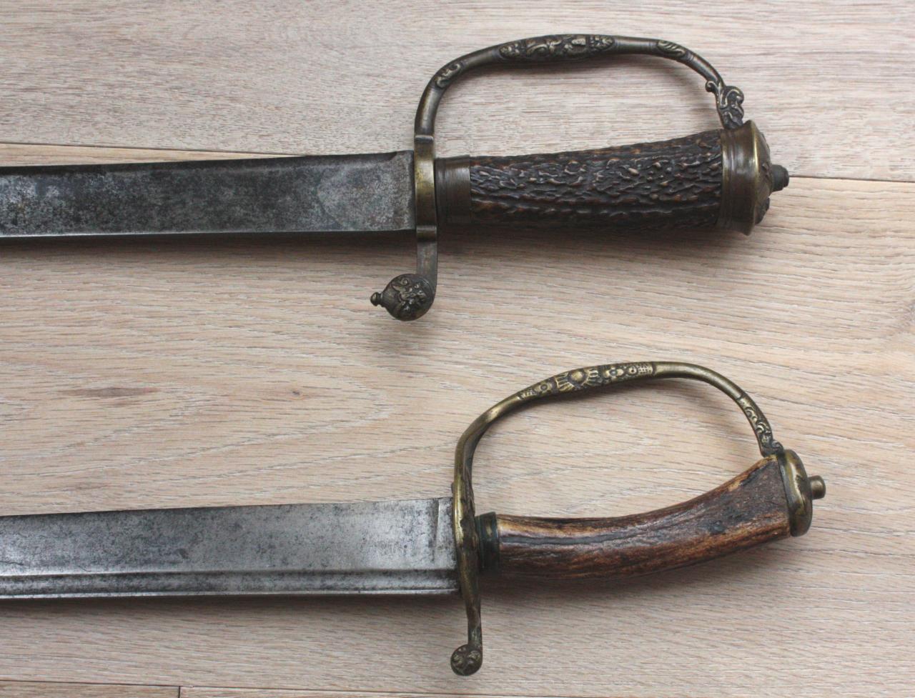 I have not examined my hangers in some time. I had thought that they were German hunting swords. The shorter one 17th c. the longer one a bit later.