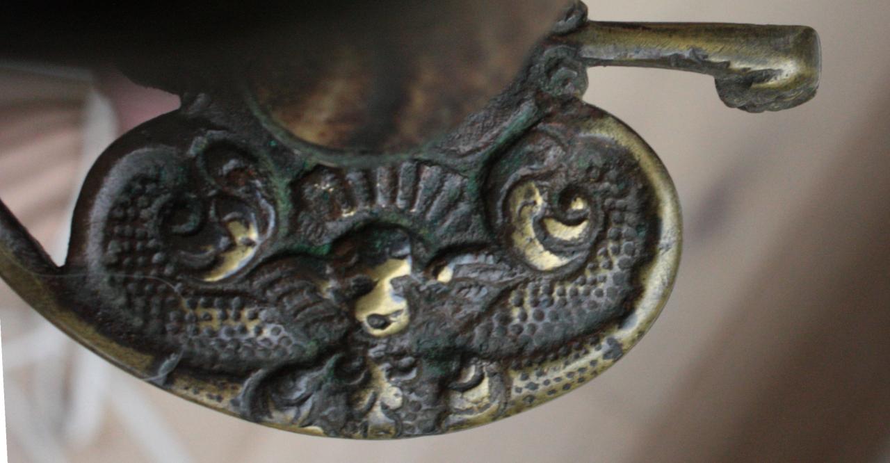 For comparison, here is a link to my other hanger from this era. Note the hanger from the other thread has similar designs, cherubs, face casting. Most were plain or had mythological figures. This one below has a much thinner piece of stag antler for grip, but a longer 27" hanger-type blade.