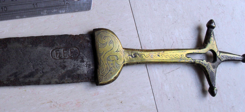 I assume that the piece of steel/iron used for the blade is a reuse, as it is stamped 'E.E.E.' Condition is solid with wear, hammer marks, pitting, some rust etc. Scabbard is brass with fine punched decoration. Brass has become brittle with age and armlet has cracked in several places and completely split (see picture). Small seam needs resoldering behind armlet. Some knocks etc. See pics, an unusual knife, and in unrestored condition that would make it a nice winter project: £70 plus registered shipping. Swaps considered, P/X etc. PM or Email: gimmieitbaby@aol.com Last edited by Atlantia; 23rd October 2010 at 08:36 PM. |