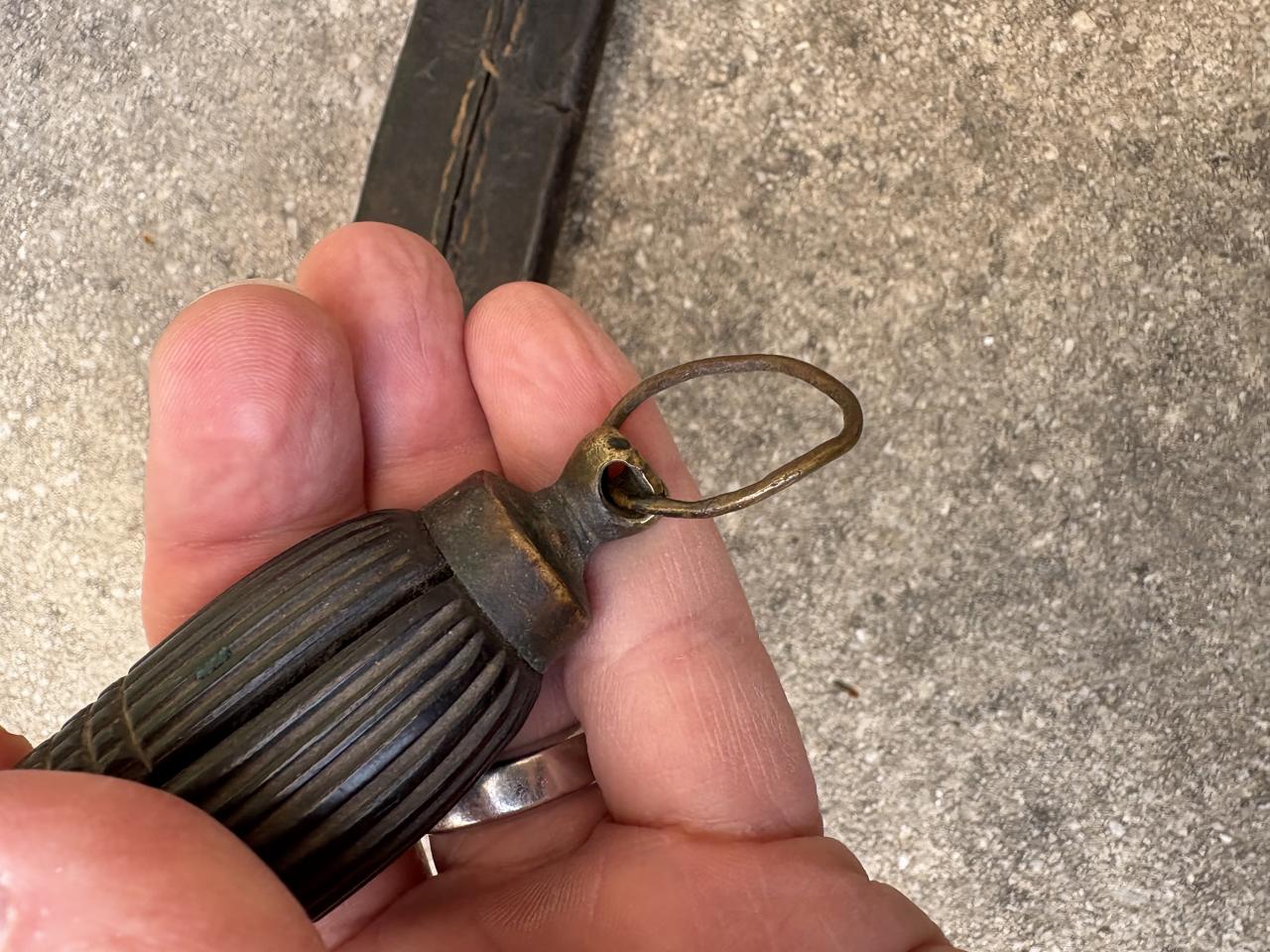 Thought I’d share this recent addition. Curved single edged blade, chisel ground (may not be obvious in photos). Tang extends through hilt with brass pommel, wire ring attached to pommel. Cylindrical horn hilt, loose. Large guard of ferrous metal. Leather sheath with embossed decoration. Blade is 39cm with overall length 49cm.