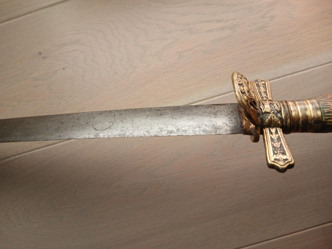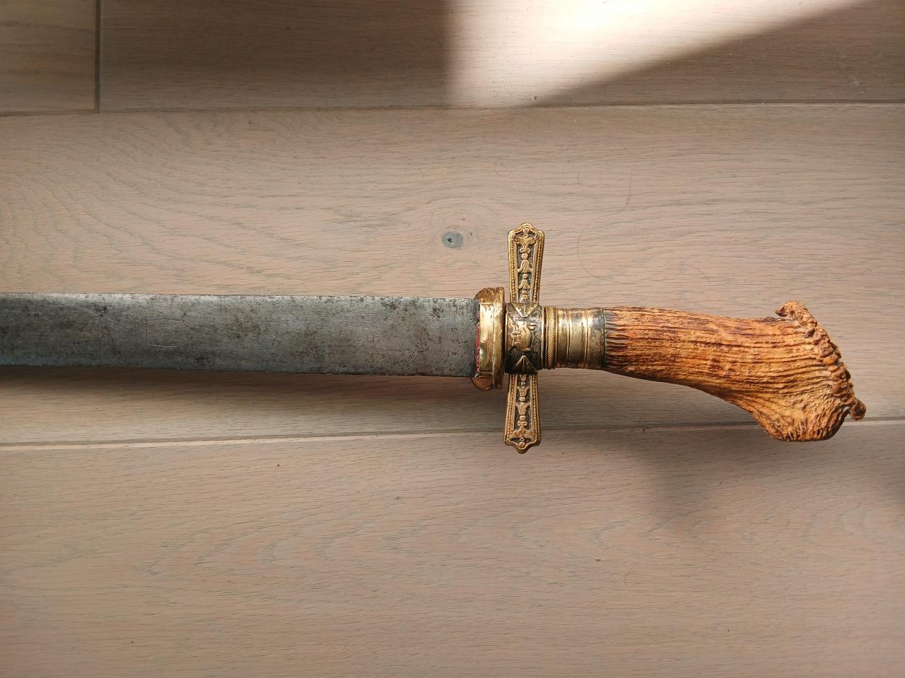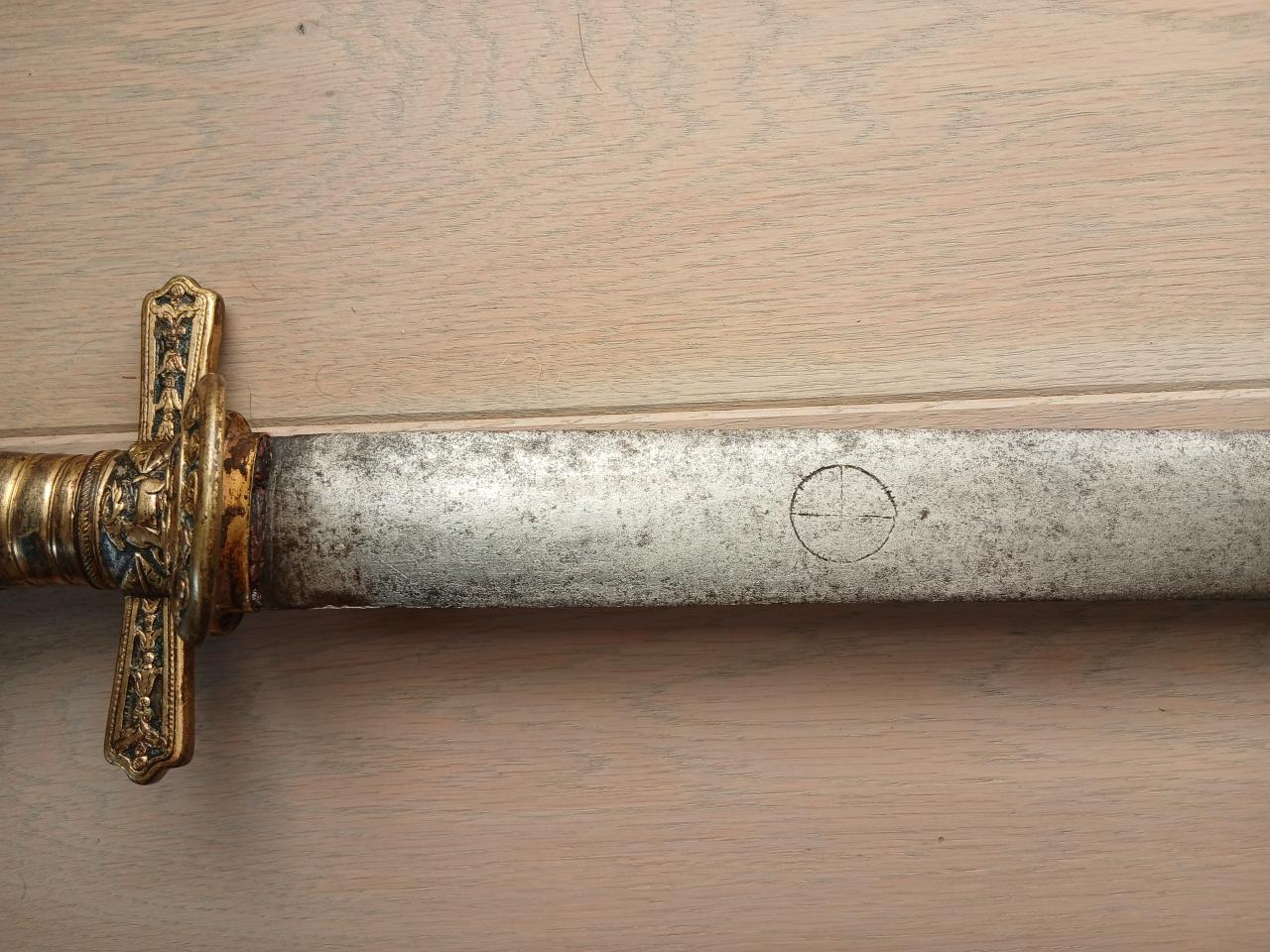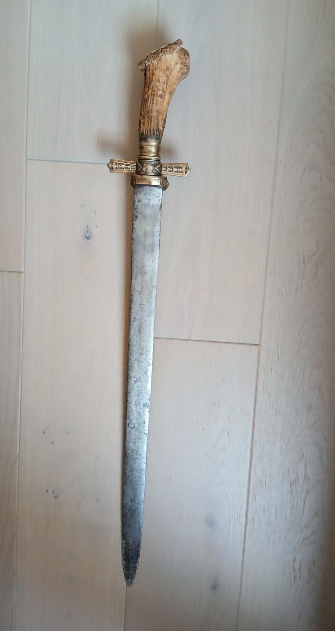 I would like to present my latest find: a beautiful 19th-century German hunting sword, XL size, with an older blade. Fortunately, the bidding didn't go too high, and I was able to get it, perhaps because it's a composite object and no one else was interested. In any case, I like it very much, and the blade piques my curiosity: Total dimensions: 80 centimeters long for a 63 cm long.flat blade and over 4 cm wide. On both sides of the blade are a wheel and a hangman's gallows (brass remains), as is the case on swords of justice. According to the sellers, this cannot be a sword of justice blade because it is too narrow, and it would rather be a shortened felddegen blade, like the one I have in the photo. It's still quite wide, not 5-6cm of course, and pointed at the end, but still a beautiful old wide blade estimated to date by the seller from the sixteenth or seventeenth century. And the decorations would have been made for of superstition/talisman. What do you think? Any comment welcomed. Kind regards |