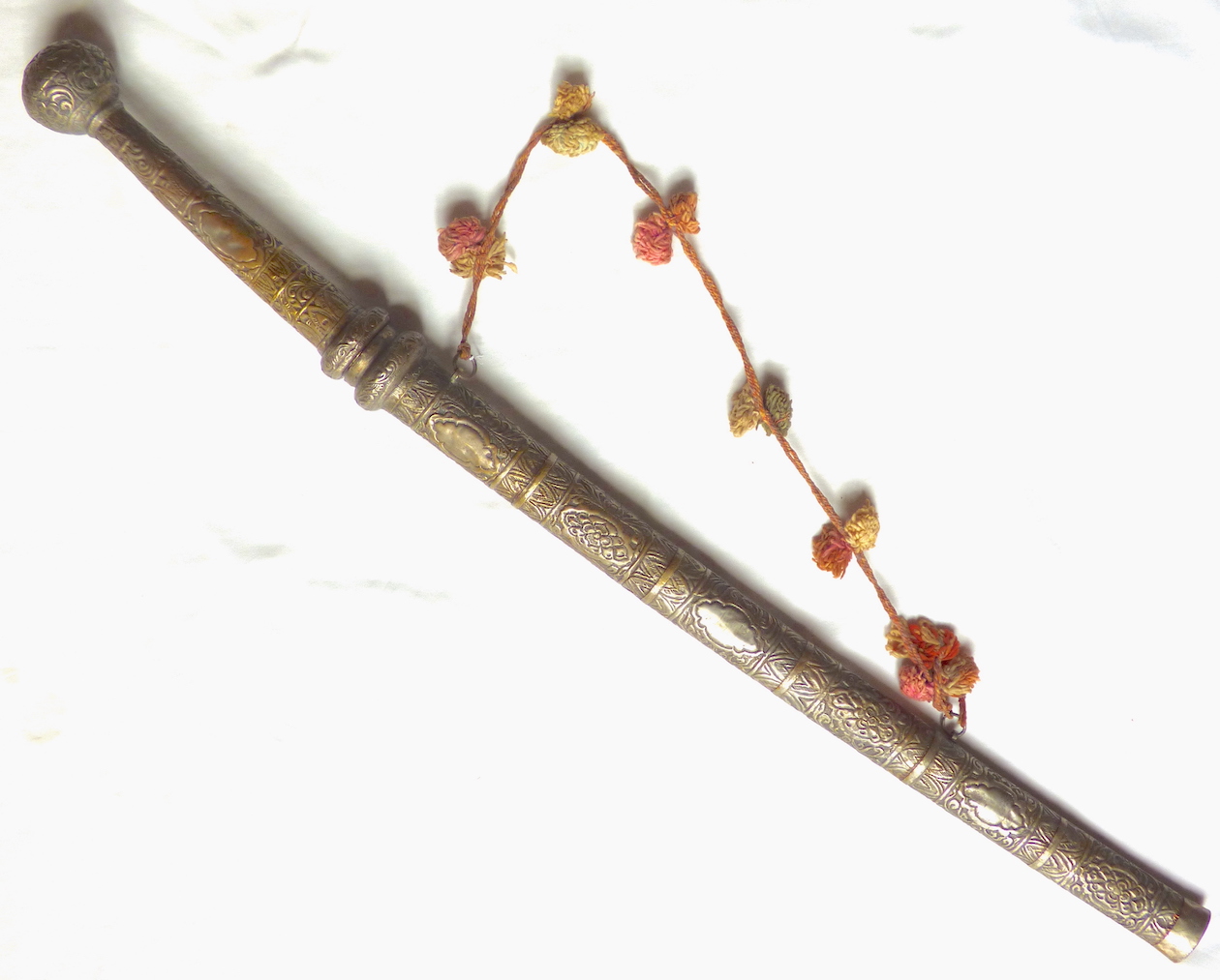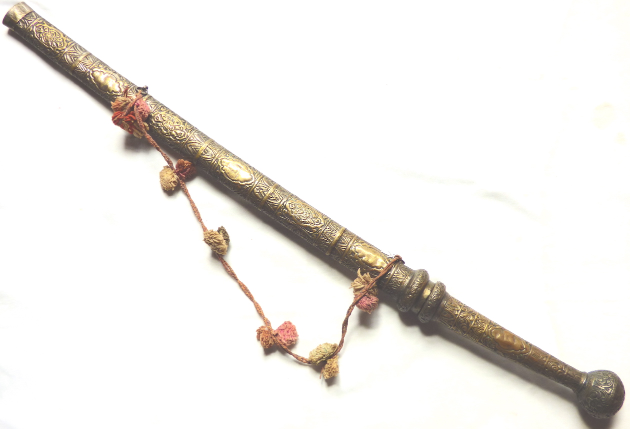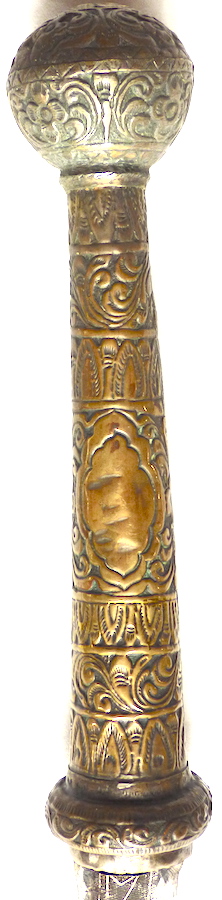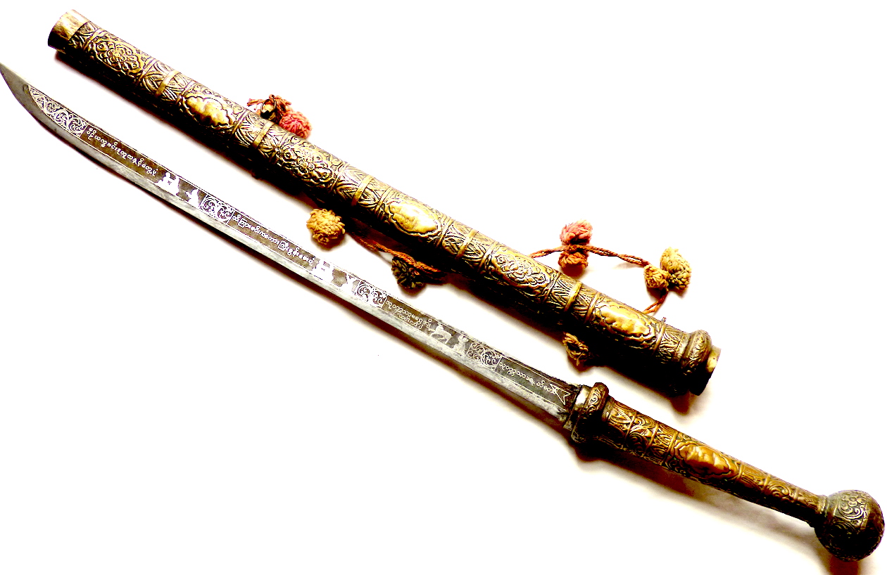 The hilt and scabbard are covered in chased brass over wooden cores. The decorations are typical Burmese vegetal designs with small blank plaque areas. The pommel is globular, probably brass over a wooden or resin core. OAL in scabbard = 46.5 in. Blade = 31.5 in. Hilt = 13.5 in. OAL ex scabbard = 45 in. Asking US$475.00 plus shipping and insurance. This is a heavy item, weighing about 2 kg when packed. I use AUSPOST to save on shipping costs (AUSPOST is half the rates charged by private shipping companies). Please check shipping costs with me. Given the current uncertain trade tariffs, I am very reluctant to ship any item to the U.S.A. Please note that I do not ship to China or Russia. |