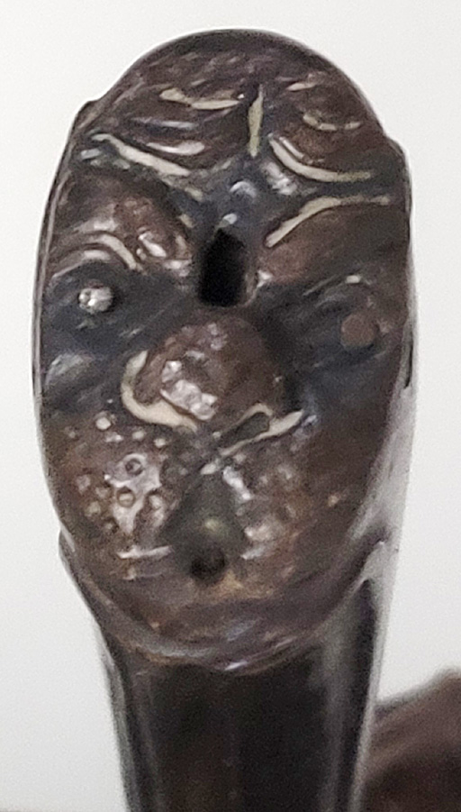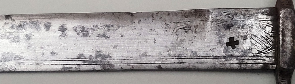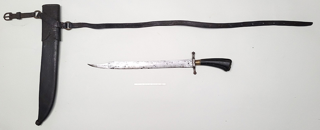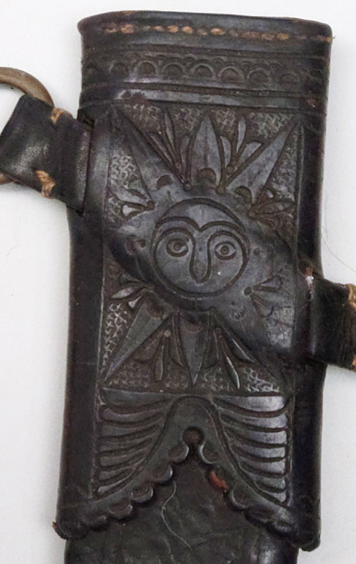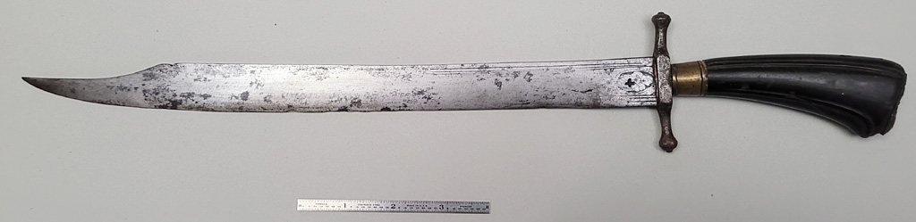I acquired this knife in 1973 in a general antiques shop in Laguna Beach, California for $75, described on the receipt as a "Spanish knife" and presented, if I recall correctly, as a relic of Old California. The blade is 13½ inches long. The grip is well carved dark horn with a brass ferrule and figural cap. The sheath is not original to this knife, as the knife only fits in backwards and opposite to the implied geometry of the sheath mouth. I solicit your opinions on where and when it is actually from.
