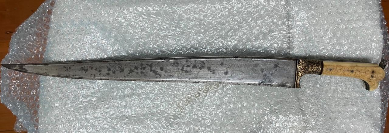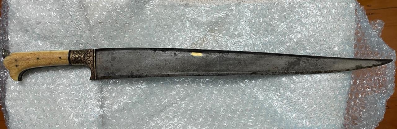 I recently acquired this nice Khyber knife. The grips are walrus ivory and the 42cm blade looks to be made of nice Persian wootz. The scabbard is long gone, but the silver scabbard fittings are still with it. I don't know very much about these things, but I have acquired a few nice wootz pieces over the years and could see enough to know that this was once a high status object. Can anybody shed any more light on it for me? Cheers, Bryce |