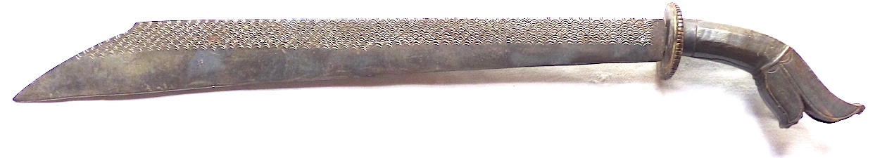 I'm interested to hear what our Indonesian experts think of this one and where it may be from. The blade has a shape reminiscent of a Moro kampilan, but much shorter. The back half of the blade adjacent to the spine on each side has repeating rows of semicircles containing "o" marks that look a little like eyes--perhaps "eyebrows and eyes" might be an adequate description for the basic motif. The bottom part of the blade on each side is smooth and has a dark patina. The width of the spine at the guard is approximately 5 mm, tapering to 2 mm before turning down to meet the tip.