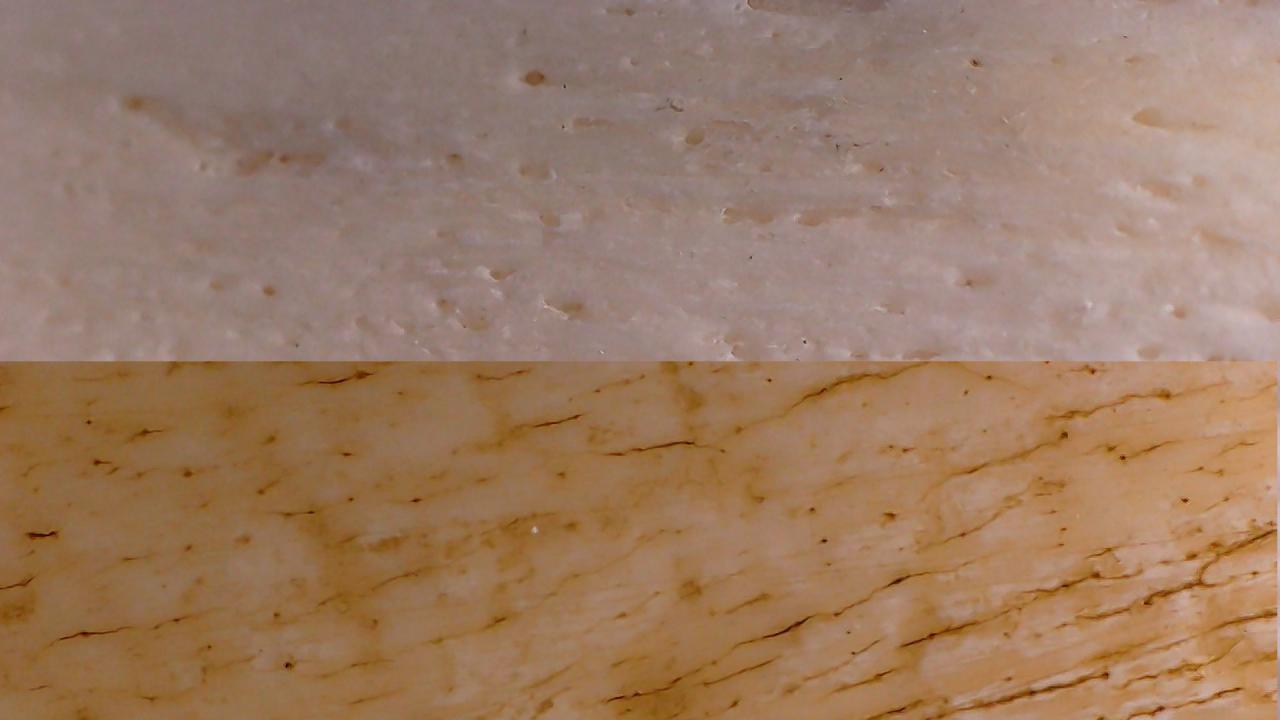 The picture shows bone on top and the grip below. Bone is covered with holes, ivory has striations. Vote now!! |