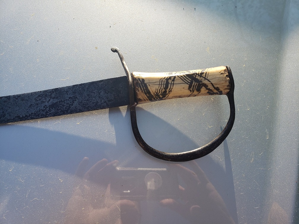 Still lovin' this cutlass. I'll go with bone. While ivory does have striations, yours has the tiny holes and what I perceive to be tiny cracks versus striations. Not to mention that ivory had a tendency to be used on more 'refined' naval pieces, such as midshipman's dirks, officer's grade swords, etc. Bone hilts were the swords for the 'working man', found on numerous cutlasses and hangers. Here's my bone-hilted hanger-