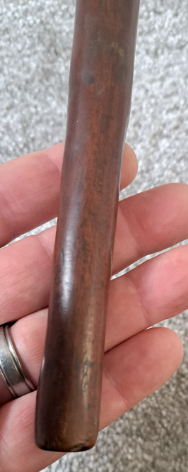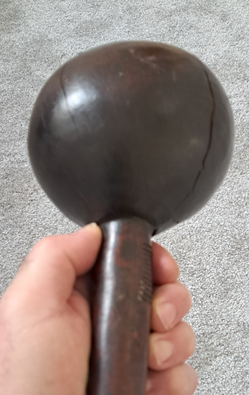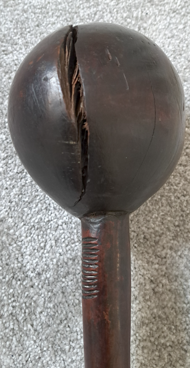 I just bought this as a Knobkerrie which I am fairly certain it isn't I assume it it is an oceanic region throwing club overall length 20 inches or 50 cm with a head diameter a shade under 6 inches or 15 cm The shaft tapers to quite narrow at the base with no flair at the but as per most knobkerries I have The head is cracked but solid and no decoration bar the notches near the head which have been there a long time (are these decoration or functional as they are done rather crudely) Good hefty weight to the club Any idea of age origin originality and all other information welcome Regards, Ken |