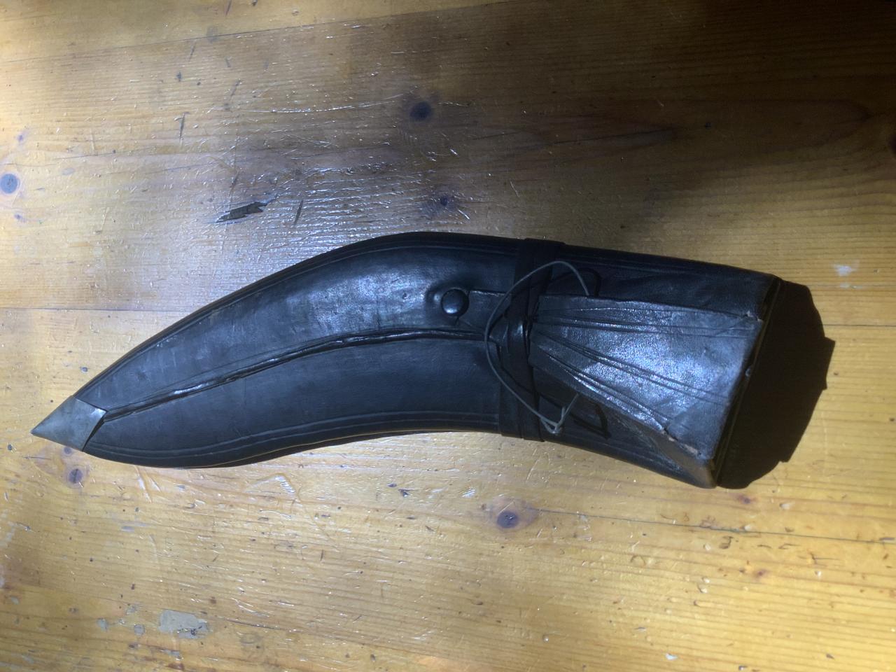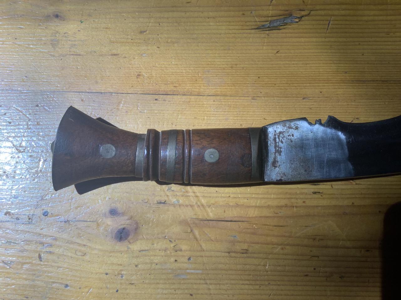 Made in Dehradun.. recently made. Last 20-40 years . They still make that "model" . There's another one the make with a horn handle and aluminium buttplate .. these have never a functional chakmak or karda.. as the Indians don't really know the little chakmaks use. (Sharpening and fire striking) So they are just rough objects. Even on old India copies, if they do include them they are just two little knife shaped things. Or sometimes two small identical knives . The chakmak/chakmaag (the Mongolian tinder box with a striking steel) was previously known in India but it was associated with military attire and just faded away with matches.. where as the Nepalis kept in in their kukri scabbards to the present day. Although you'll be hard pressed to see a Nepali who and strike a fire with it these days. Maybe some very old men..but they know what it is. |