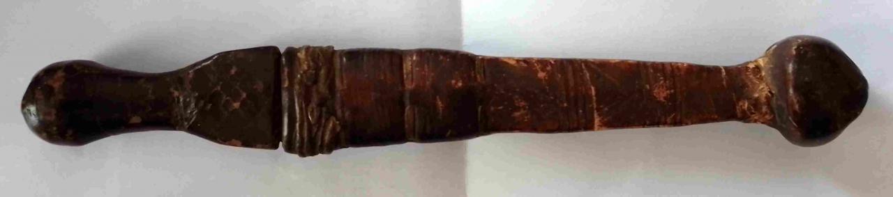 The handle and the leather-covered sheath, stitched on the reverse.