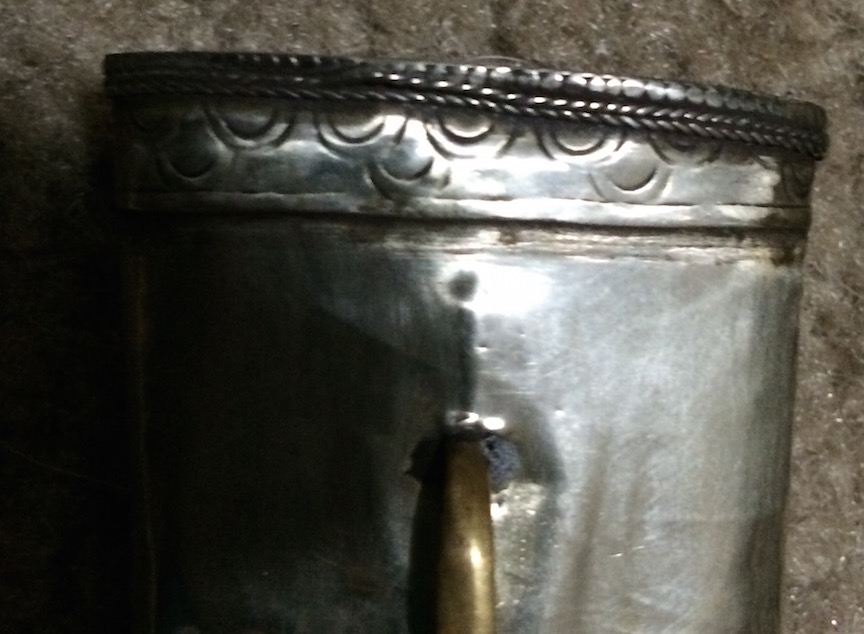 Up for sale is an unusual dagger. I assume that it is of WWII vintage, but could be a little earlier. The blade is Euro-American made. However, the hilt is T’boli made, cast and chased in brass/bronze with a wooden pommel. But the scabbard is wood covered in white metal, made by a Maguindanao artisan. The cental section seems to be made of cord.