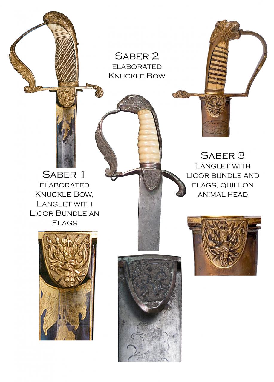 For research purposes, I am looking for comparative sabres that have the same type of elaborately designed knuckle bow (hand guard) as saber 1 und 2 below. It would be even better if the langets were decorated with lictor bundles and flags (trophies of arms), Saber 1 und 3 below, or if they had a straight quillion that ends in an animal head as saber 3 shown.