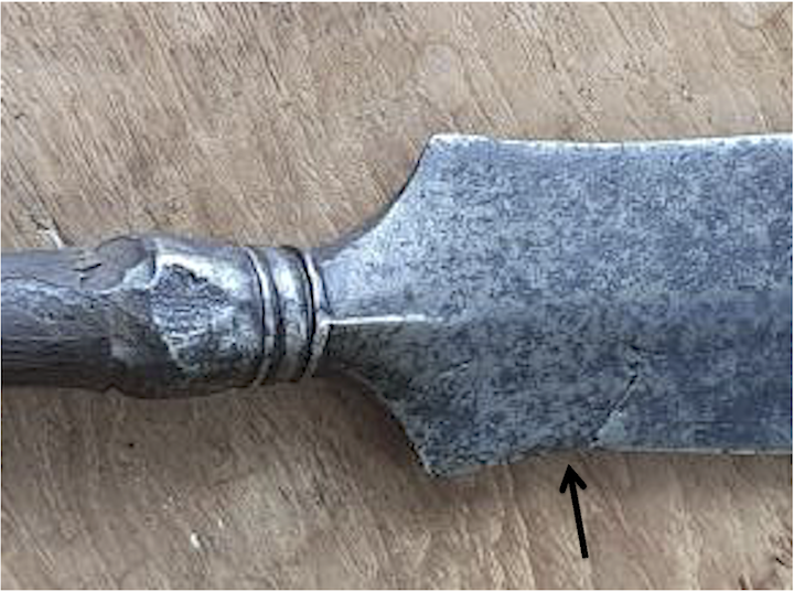 In looking further at your spear head, I notice that it has some old damage to the blade. In a blow up of your picture, I see a piece missing on the bottom edge (arrowed). There is a crack in the steel which may have been a forging flaw or caused by contact.