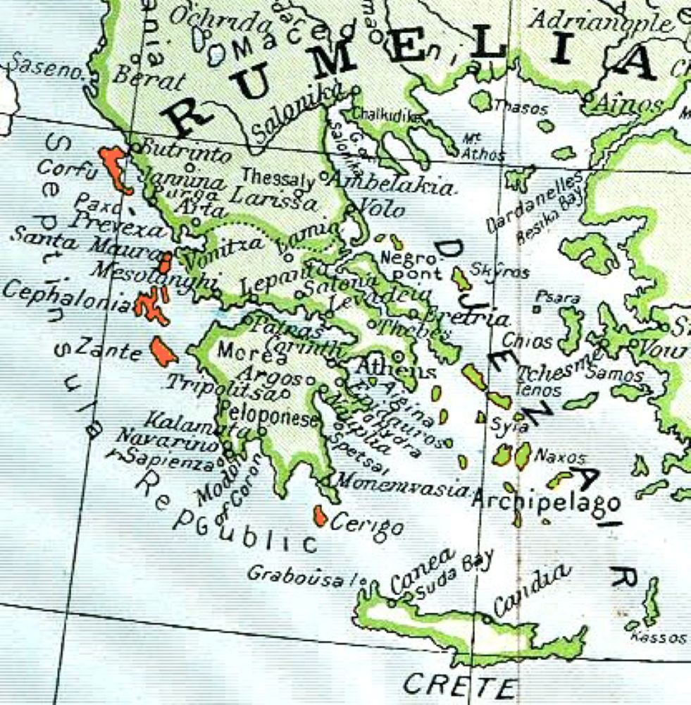 By his own account, he never lost a single ship in battle, and none of his subordinates were captured. Ushakov won five major naval battles and suffered no defeats. In 2001, the Russian Orthodox Church canonized him as a righteous warrior. During the Mediterranean campaign of 1798-1800, Vice-Admiral F. F. Ushakov distinguished himself as a major naval commander, a skilled politician, and a statesman during the establishment of the Greek Septisi Republic under the protectorate of Russia and Turkey. Upon the Russian fleet's departure from the Ionian Islands to the Black Sea, the Cephalonians, as a token of their gratitude, presented Ushakov with a large gold medal bearing images of the admiral (inscribed around it: "The valiant and pious Fyodor Ushakov, Commander-in-Chief of the Russian Fleet"), the fortress of Corfu, and the islet of Vido, with two French ships moored between them and six Russian ships in front of Vido (inscribed: "To the savior of all the Ionian Islands, Cephalonia"). Among his many awards, he was awarded the Golden Weapon (of the Septisi Republic). I have been trying unsuccessfully to obtain information about this weapon for a long time. Does anyone have any information about this weapon? The portrait presented was painted after the admiral's death, depicting a very interesting sword. What is this? Is it the same award sword, or is it a figment of the artist's imagination? For reference: Republic of the Seven United Islands, was an oligarchic republic that existed from 1800 to 1807 under nominal Russian and Ottoman sovereignty in the Ionian Islands (Corfu, Paxoi, Lefkada, Cephalonia, Ithaca, Zakynthos or Zante, and Kythira). |
