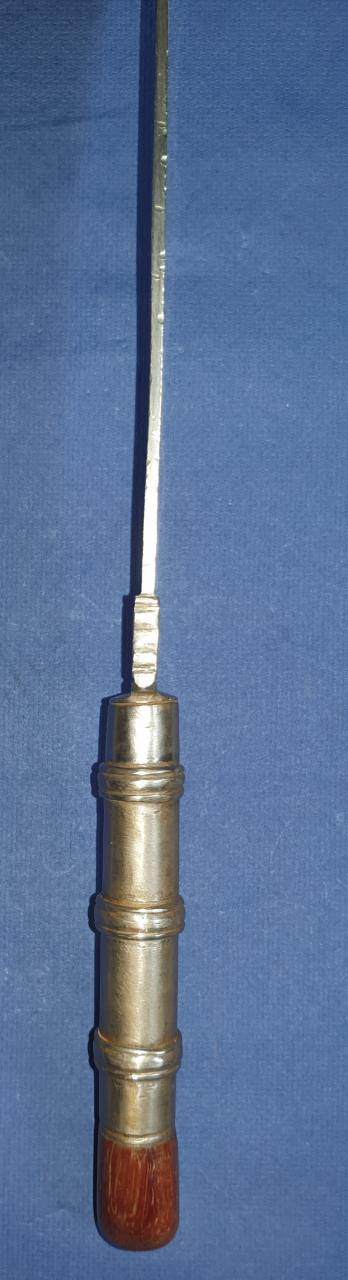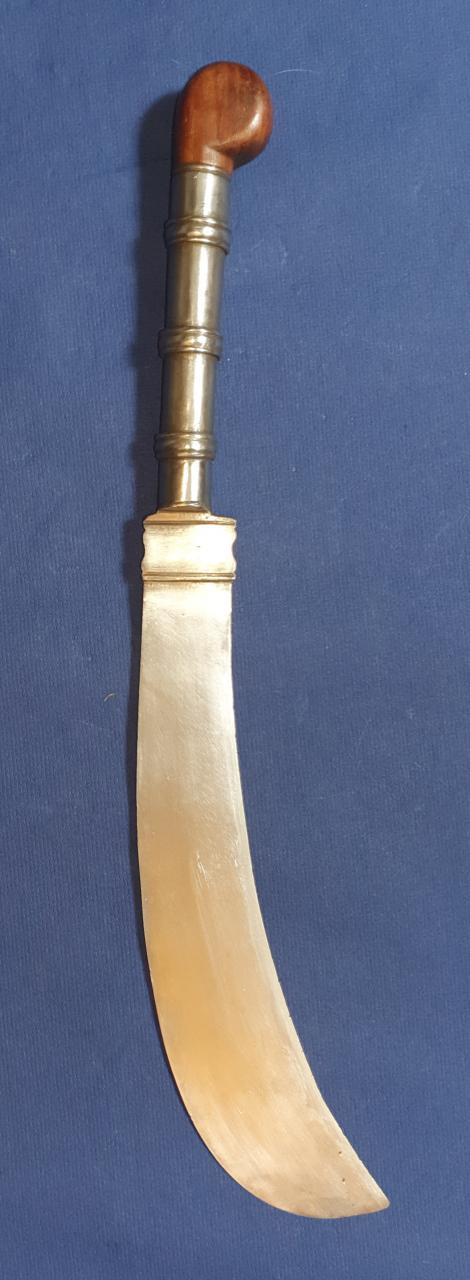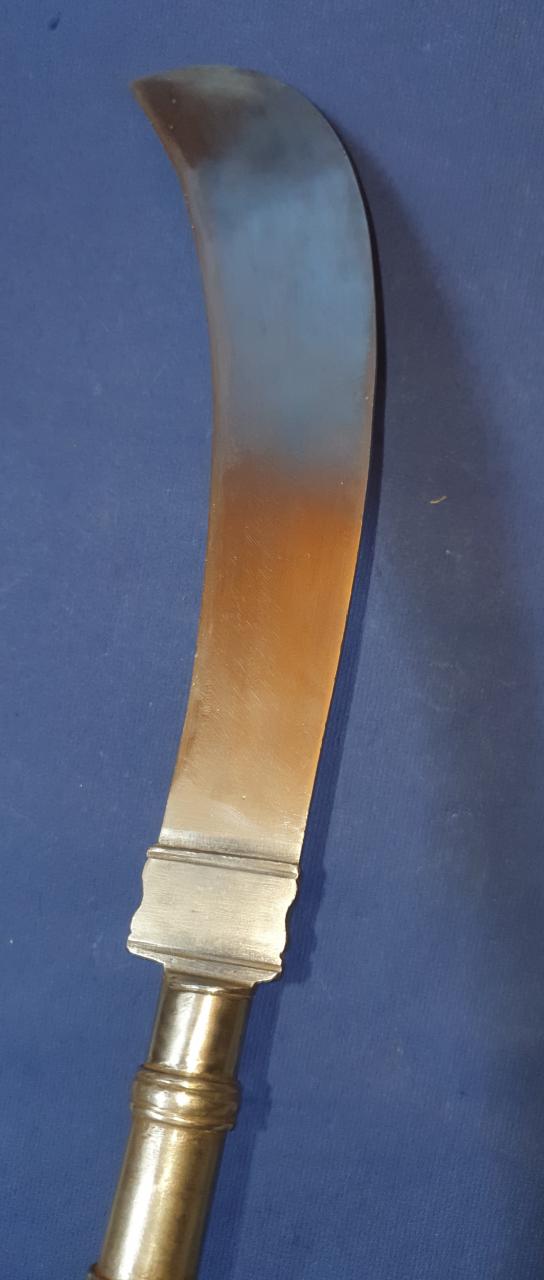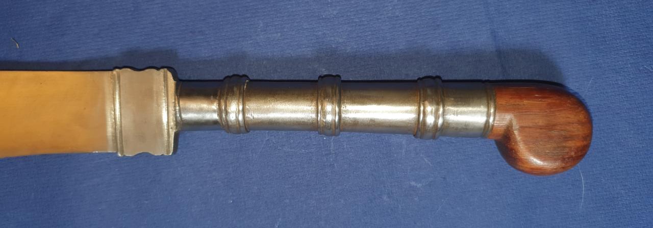 I offer this katthi from the Moplah people from the Malabar region of India. A quite heavy and robust chopper made for use. A four part iron ferrule give strength to the handle, thick (7,5 mm) ricasso, one-sided beveled cutting edge. Nicks to the edge and some spine damage, see pics.