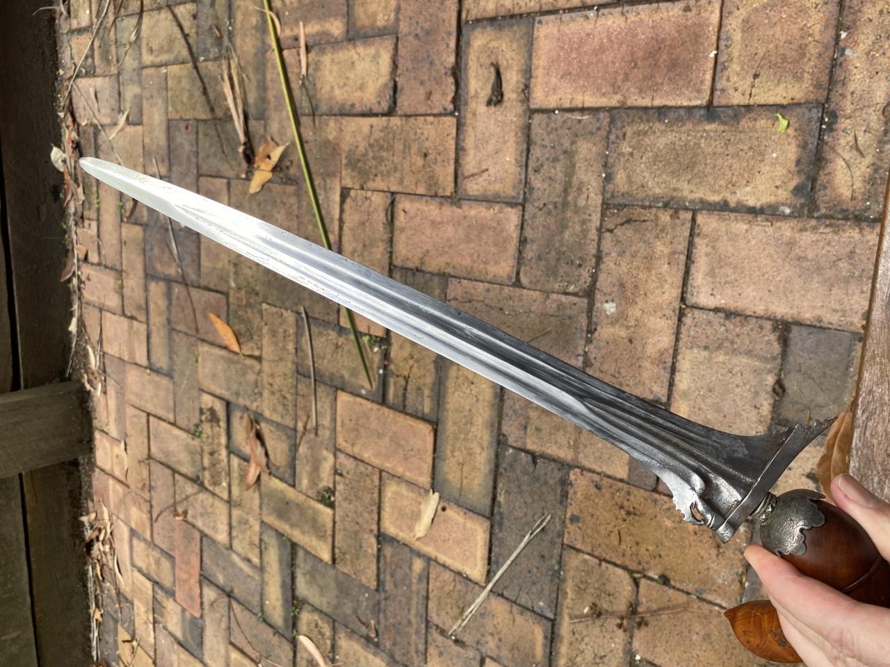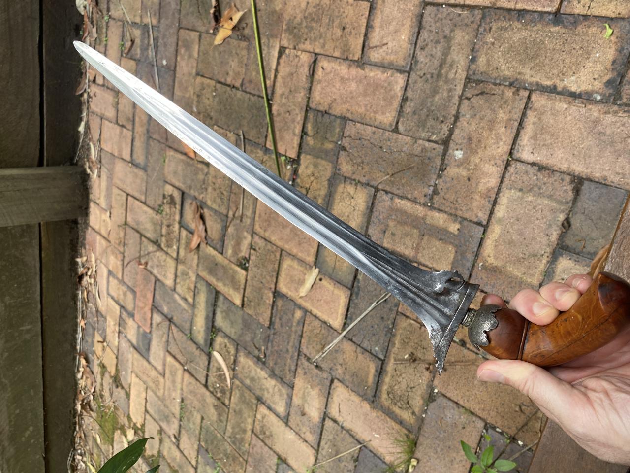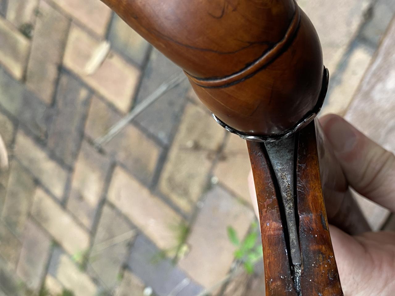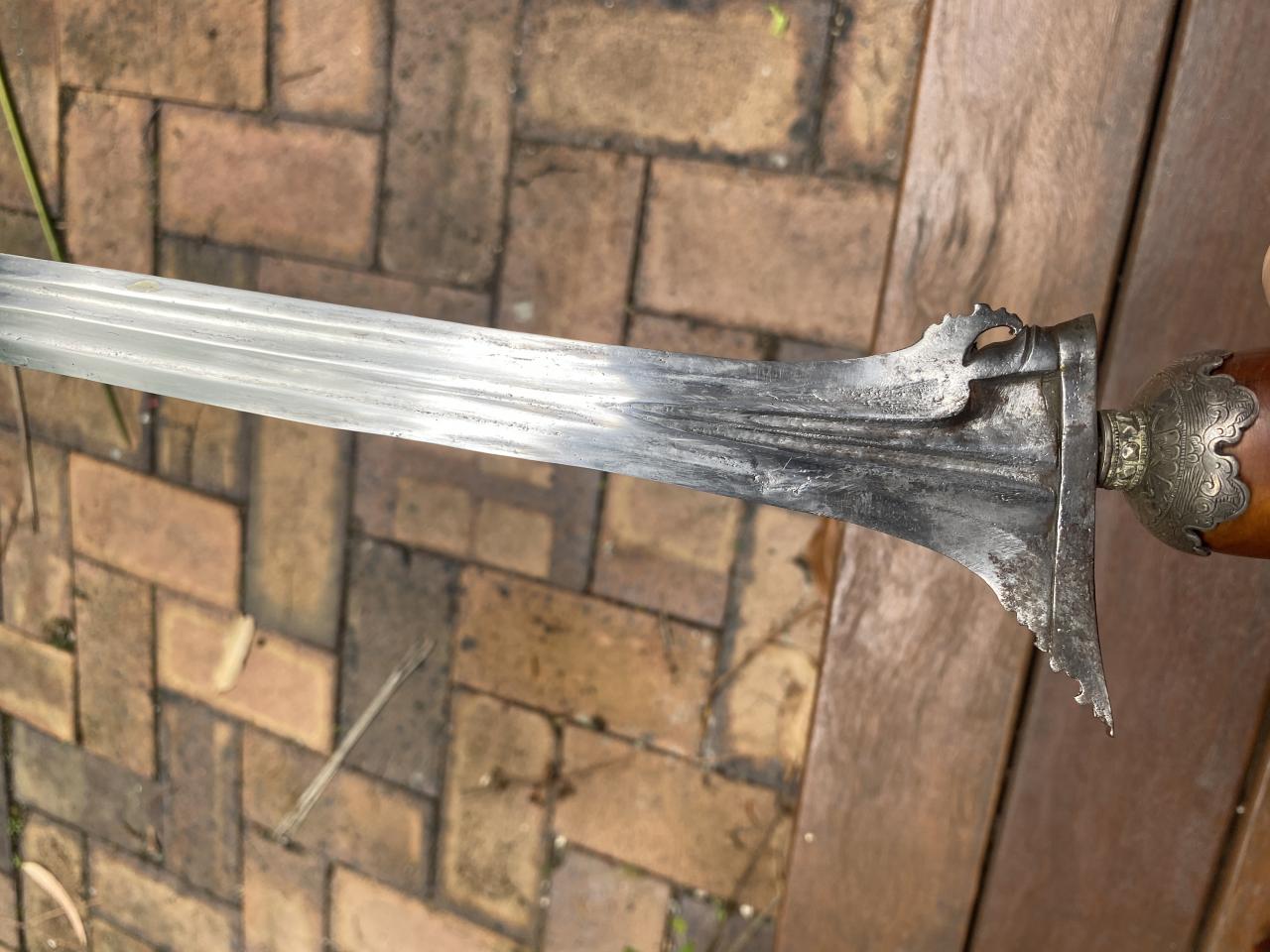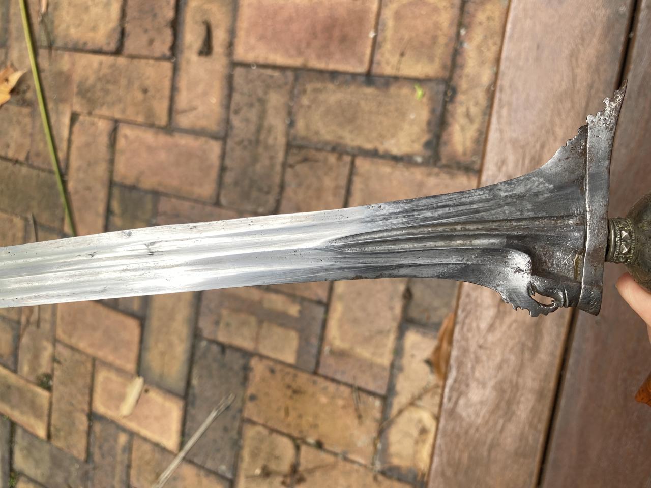 I'd much appreciate any insight into this keris; old Makassar/Ladrang type sampir, which is very narrow; I'm thinking Sumatran, possibly Mingangkabau. It didn't come with a hilt cup, so I added this one. I have not touched the blade. Many thanks