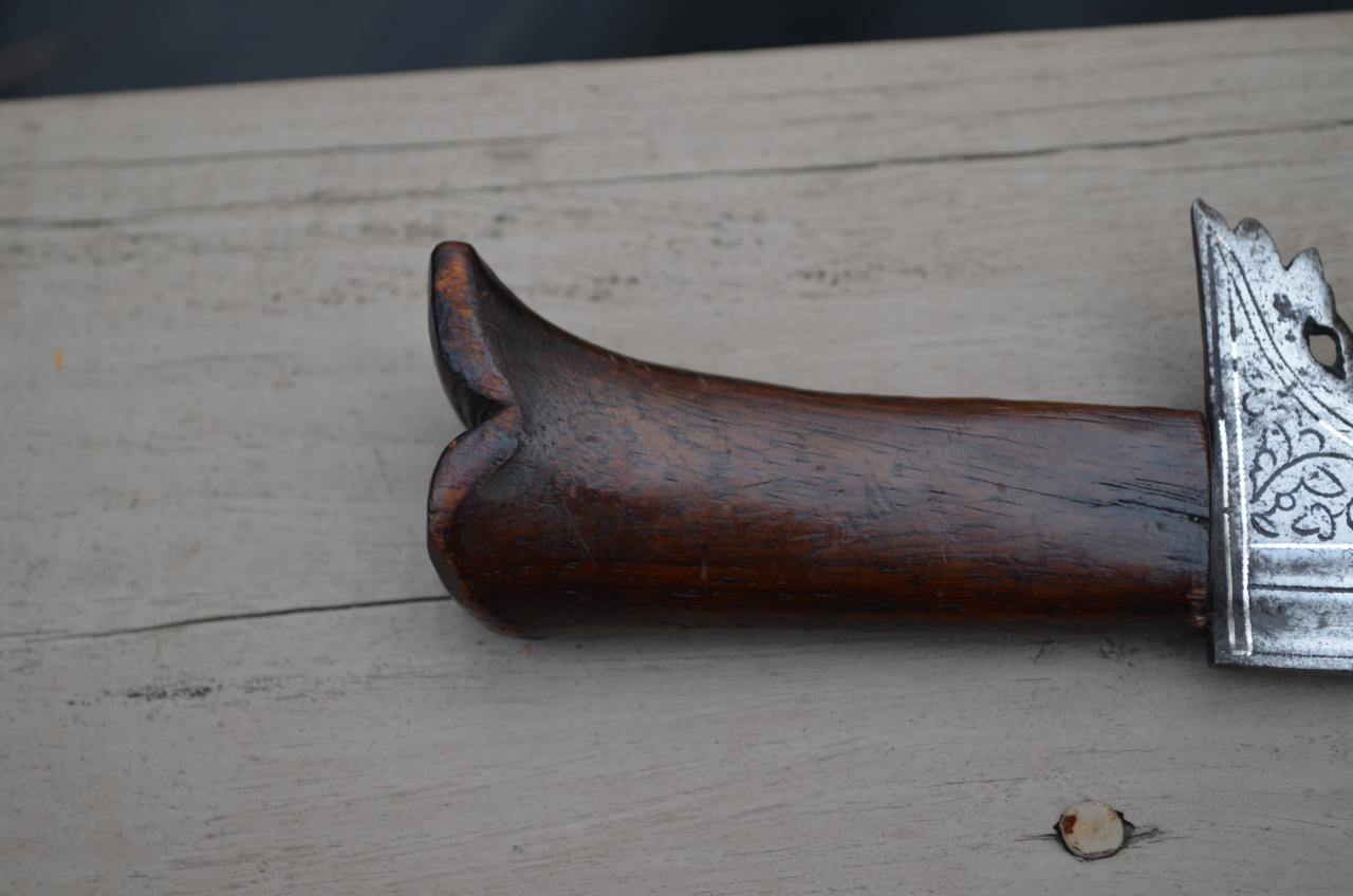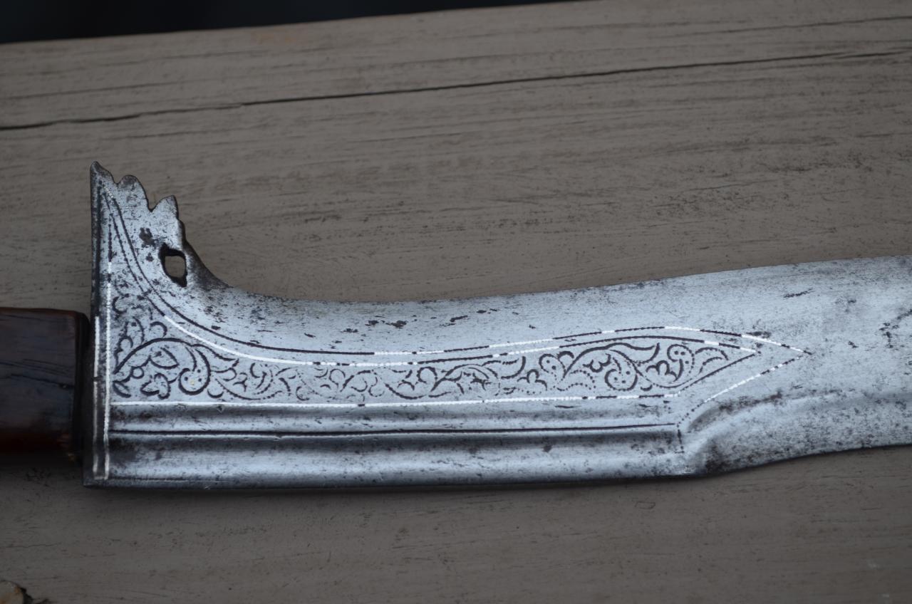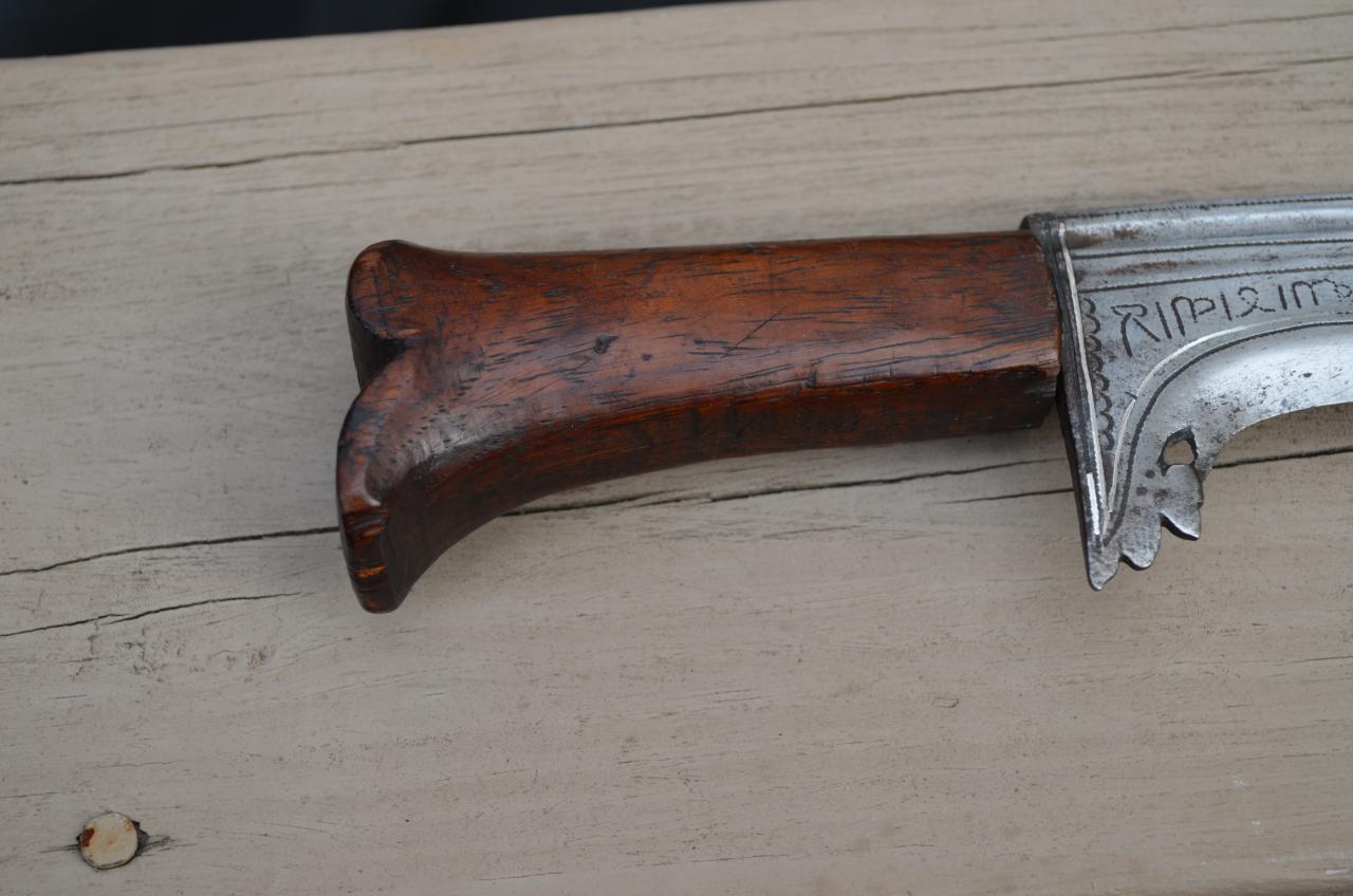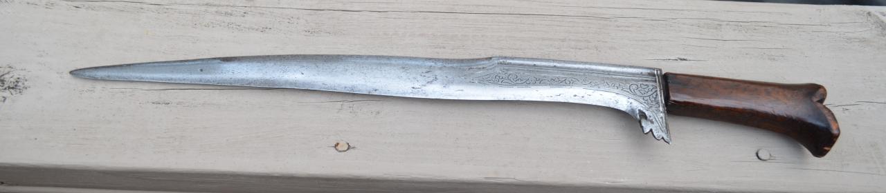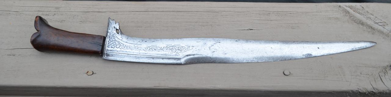I recently acquired this knife that is a composite. The blade looks like it could have been a Kris at one time or another and it has traces of silver inlay.