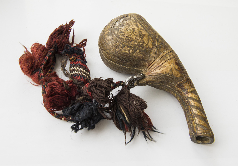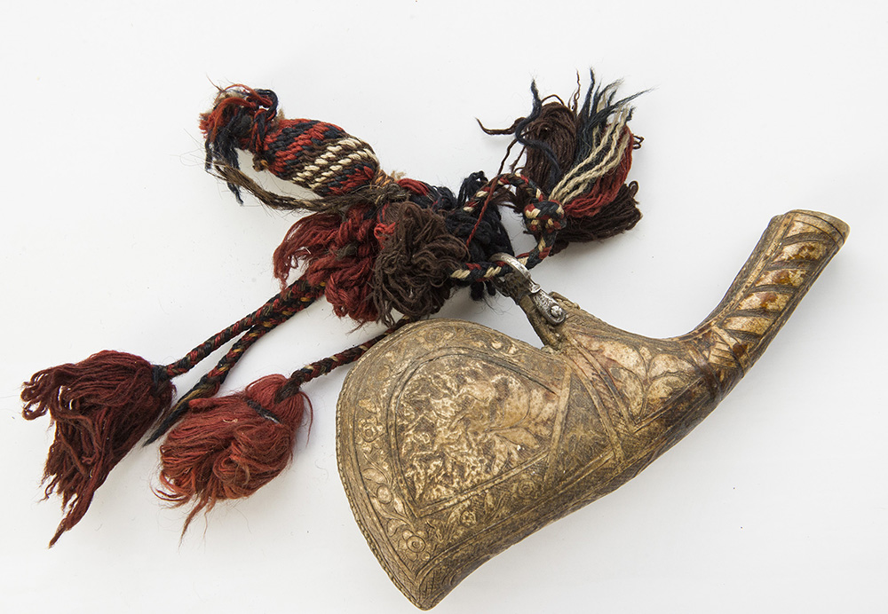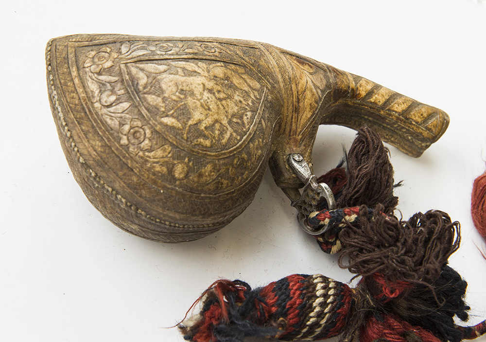 Tooled hide in a “camel scrotum” form. Hunting scenes on both sides. Fine fittings made of steel and wool. Nice patina. The plug/cap is missing. 24 cm long. Asking price: 160 Euro. Please ask any questions: tvdianova(at)yahoo(dot)de |