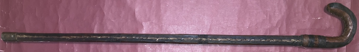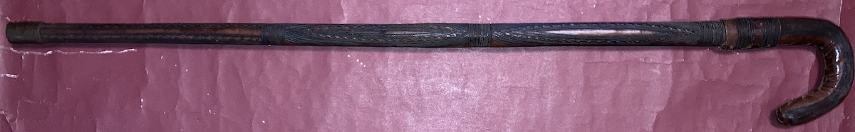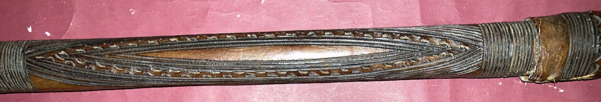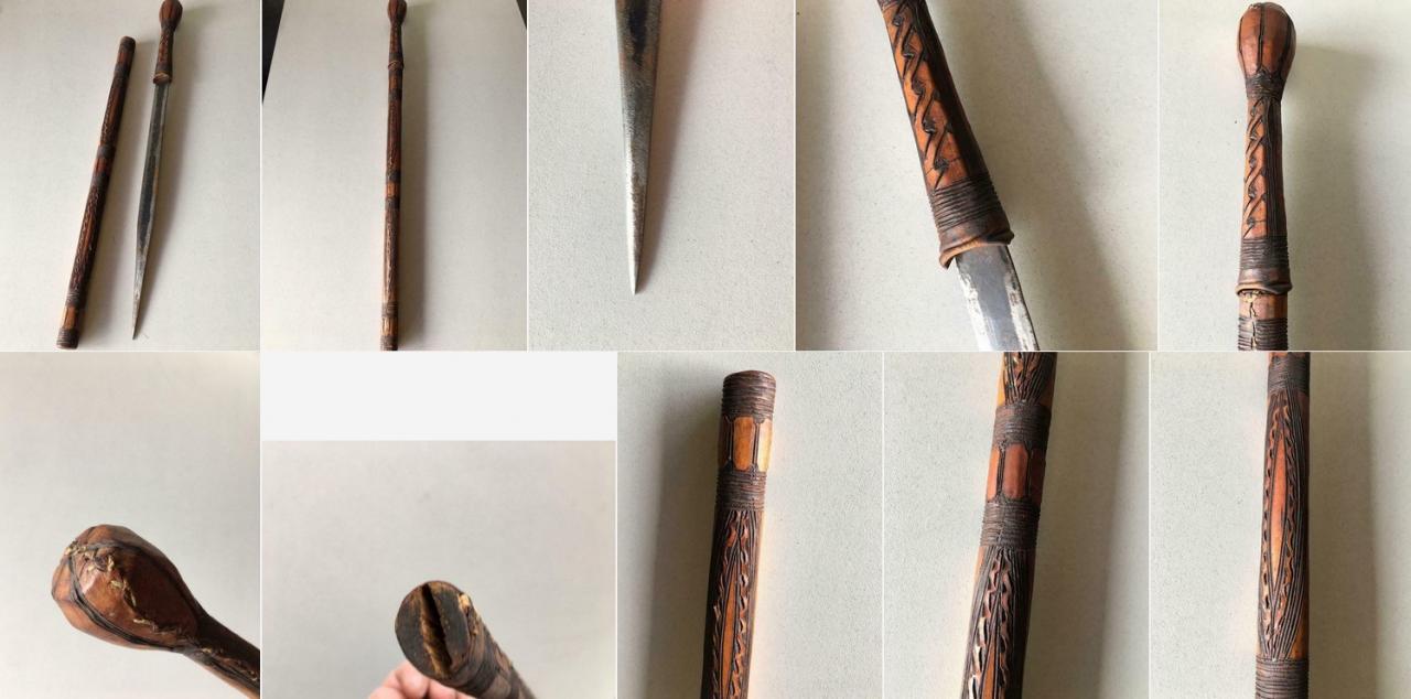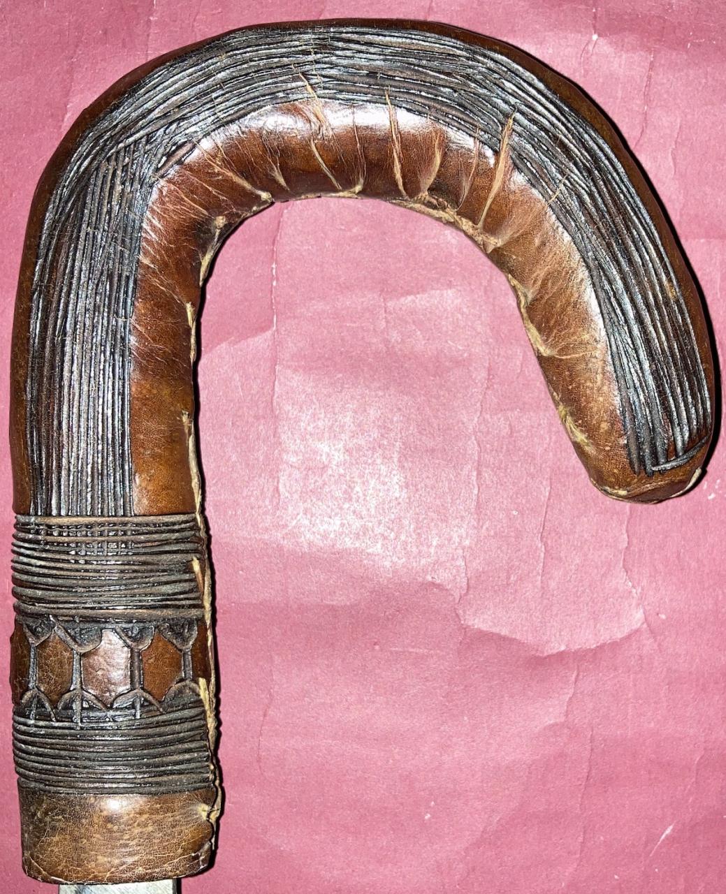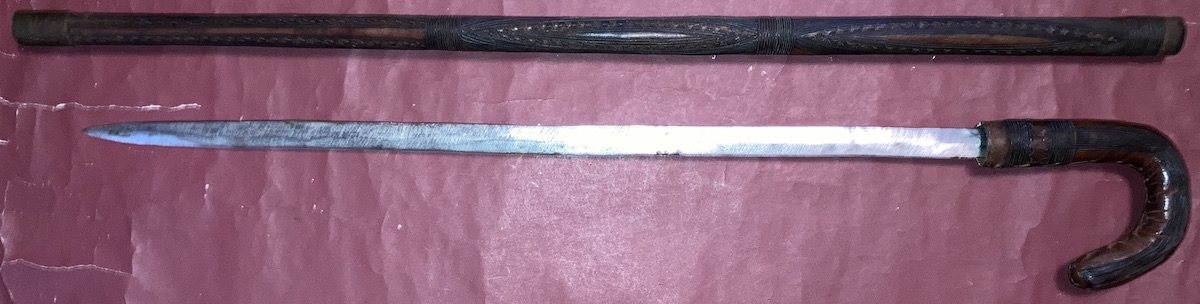 Interesting. Its a very different blade than I have seen in contempoary use with the northern parts of the tribe's range. The shape suggests a very different kind of swordsmanship than the ones I saw (a double edged blade that slightly widens towards the tip with a short point almost in the shape of a Calabi triangle and leather scabbard). The point change could be due to fairly strict government regulation of weapons in some areas, but I don't think the example shown would butcher a cow quite as well. This one's overall appearance as is, is shaped like maybe it is carried in the hand. Sword cane or cattle prod? Or does it get a wrap on the scabbard that would attach it to the wearer or help it be retained by sash?