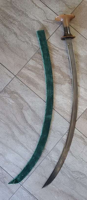 Here is shotel in my collection. It is a well-forged, double-sided sword 31 1/4 inches in length with a 27 inch curved blade. The blade is flat with diamond cross-section. The hilt is wooden with a copper disk at the pommel. The typically-colored red leather scabbard has decorative designs from top to bottom on both sides and is in good condition although very stiff.