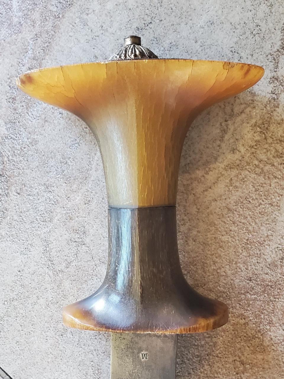 With respect to the hilt materials, while I have not been able to confirm this, I've read at least one source that claimed the light colored, yellowish hilts were made of giraffe hoof, whereas the darker horn may be either rhino or bovine. But then again, buffalo/cow horn comes in different shades so perhaps the giraffe hoof is just a bit of fanciful advertising. Both pieces of your grip look like horn to me, rather than wood.