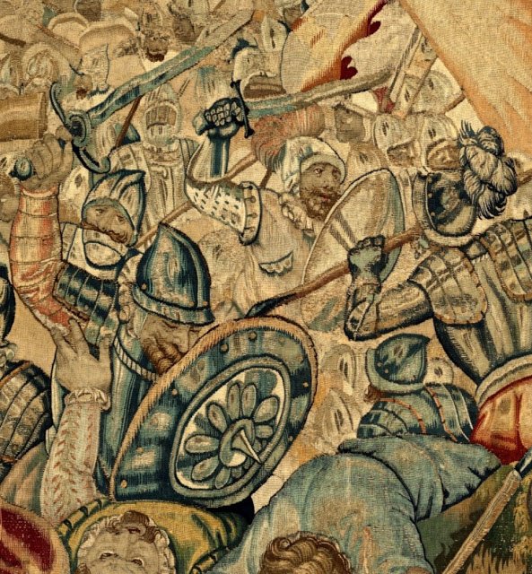 Second: Rodeleros fighting during the Siege of Hulst 1596. Detail from a Flemish tapestry
