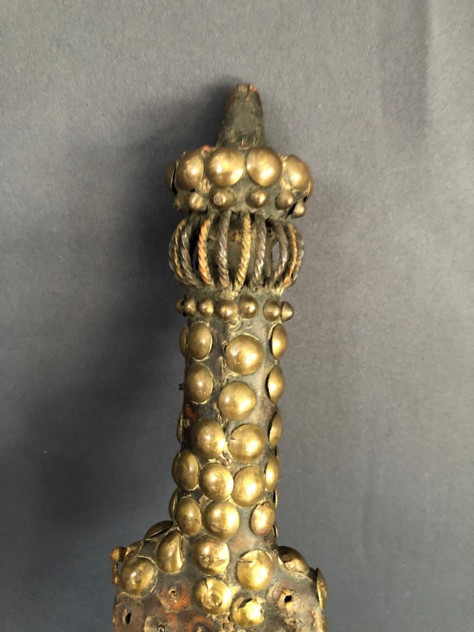 Nice sword Pertinax, and the patina on the hilt and blade do suggest some age. The presence of these upholstery nails does seem to indicate a late 19th/early 20th C foreign influence. Perhaps it was simpler (and cheaper) to use brass nails to embellish the hilts rather than some of the traditional cast brass/bronze elements. There appears to be residue from an old polishing compound between and around the nails, again an influence from outside the culture.