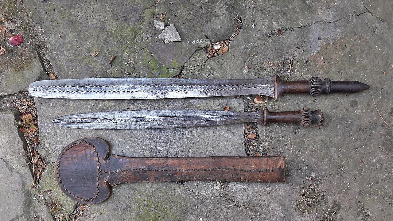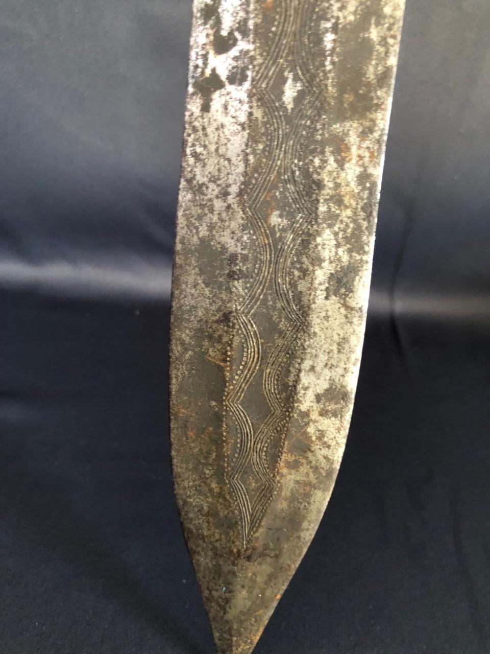 Well, what can I say – a real African gladius. In general, the sword pleasantly surprised me with its quality of manufacture. If you don’t take into account swords with European blades, then, perhaps, such quality of forging is rare for Africa, except for Berber fleece. A fully functional item, definitely not a souvenir. Overall length – 580 mm, blade length – 455 mm, blade thickness – 6-7 mm, weight – 508 g The wooden handle is covered with leather. Upon careful inspection, I came to the conclusion that the pommel could have been in the shape of a cone, but was broken off during use. In the thread about Baule http://vikingsword.com/vb/showthread.php?t=8143, participants expressed the opinion that the handle has nails for upholstery from the 19th century, clearly of European manufacture. Looking at swords with similar decor on the handle, I thought that the items were made +/- at the same time and in the same region, by different tribes. Such nails are not found on later items. As a version - at the end of the 19th - beginning of the 20th century, traders brought a batch of nails for upholstery to this region, and local blacksmiths began to use them in decorating swords. What are the opinions? |