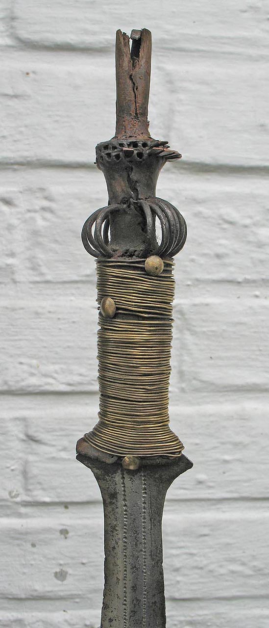 I have a sword that looks like the sister of the one in Pertinax's post, except for the end of the handle, which actually has a cone-shaped tip. The cone is very small, however, and different from the one found on classic Yaka hilts. This sword was sold to me as being made by the Chokwe people. |