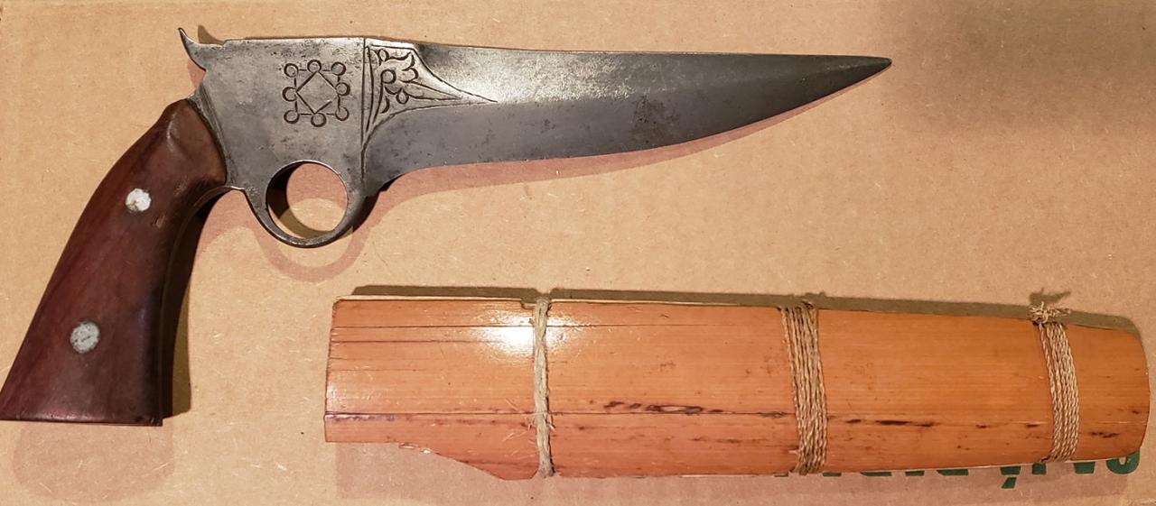 I recently picked this up in a junk shop and it came i the dayak scabbard, the blade was covered in a dry grease ,I've cleaned it up a little , I just wondered if the design has any meaning or just decoration , it's quite a large heavy blade