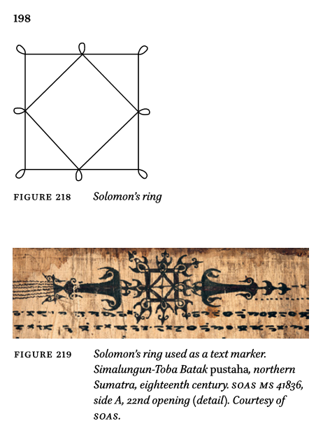 Yahya, F. (2015). Magic and Divination in Malay Illustrated Manuscripts. Brill. "This design is an ancient one- Schuster has traced its earliest appearance to an amulet from Mohenjo-Daro dating to 1,300 BC (at the latest), and it is prevalent in South and Southeast Asia and even in Europe according to Shaw (1971)." I used "Seal of Solomon" because as noted in your Wikipedia entry, the term is interchangeable with "Ring of Solomon." The image in the book is captioned as "Solomon's ring." ![]() |