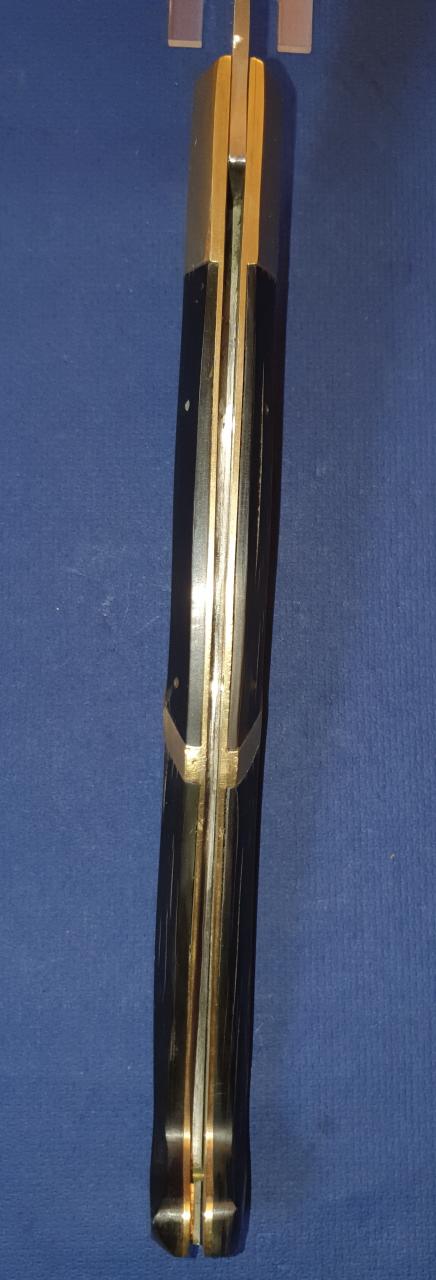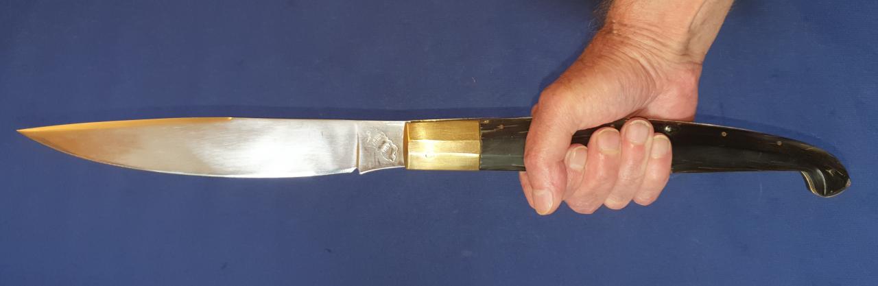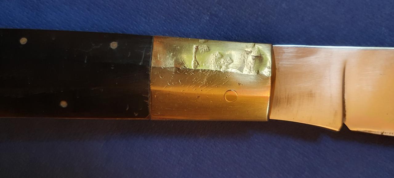 There are scratches and dents especially to one of the brass bolsters and seemingly a repair/restoration to one of the presumably muflon horn handle scales. The blade which is very sharp shows sharpening traces at the edge. There are also fine crevices at the horn scales. Over 50 cm opened, blade 23 cm, a little bit under 27 cm closed. 572 gram. Asking price is 250,- Euro plus shipping. Contact me by email: deuterdetlef@gmail.com |