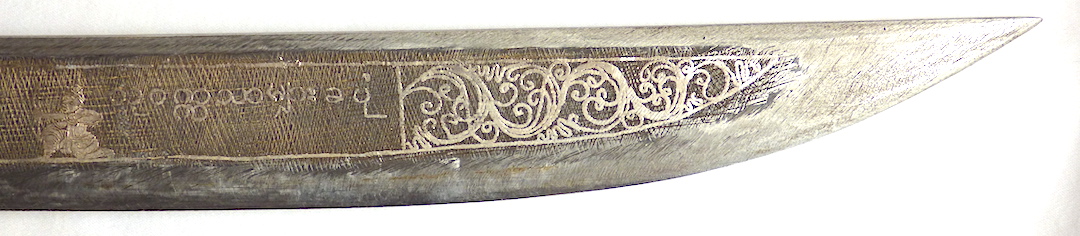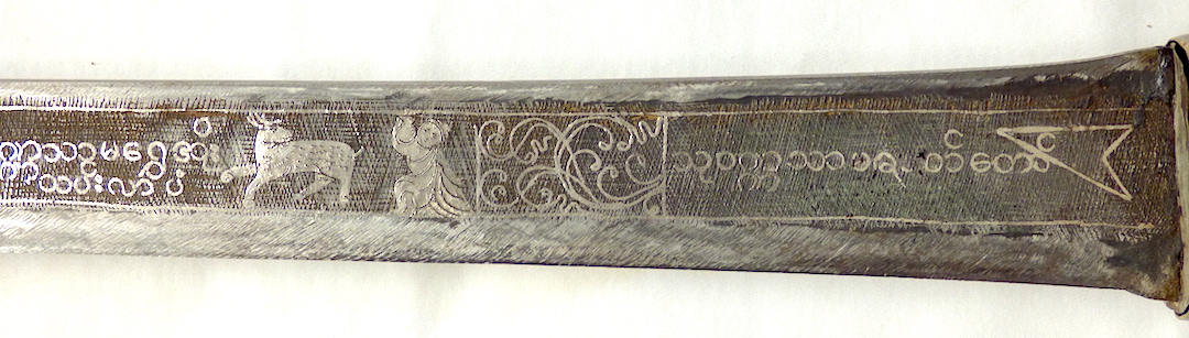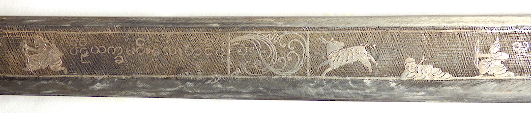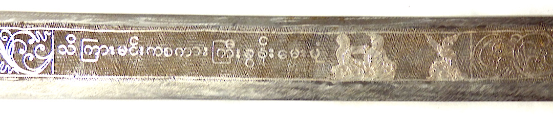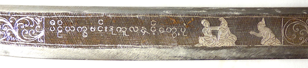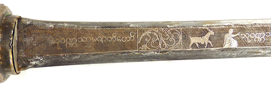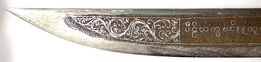 The hilt and scabbard are covered in chased brass over wooden cores. The decorations are typical Burmese vegetal designs with small blank plaque areas. The pommel is globular, probably brass over a wooden or resin core. OAL in scabbard = 46.5 in. Blade = 31.5 in. Hilt = 13.5 in. OAL ex scabbard = 45 in. Asking US$475.00 plus shipping and insurance. This is a heavy item, weighing about 2 kg when packed. I use AUSPOST to save on shipping costs (AUSPOST is half the rates charged by private shipping companies). Please check shipping costs with me. Given the current uncertain trade tariffs, I am very reluctant to ship any item to the U.S.A. Please note that I do not ship to China or Russia. |