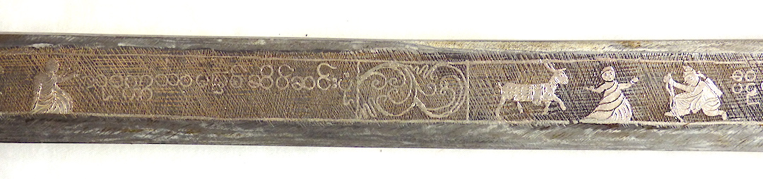 This late 19th C dha is a very nice example of a "story dha," with fine silver khoftgari work on the blade. The inscriptions usually describe historical tales of valor and are decorated with various figures and scenes. I have provided pictures of the both sides of the blade.