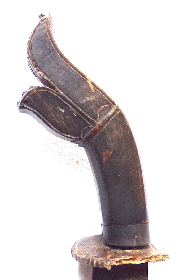 Your sword looks like a semarang from Halmahera, compare it with my semarangs. It has some unusual features, the blade decoration as well the guard. It could be that it is a pure dance sword for a boy due to its small size, my smallest is 64 cm long. Also unusual is the handle material, it looks like horn!? And yes, when it is indeed a semarang the handle should be an interpretation of makara. http://www.vikingsword.com/vb/showth...ight=halmahera & http://www.vikingsword.com/vb/showth...ight=halmahera Regards, Detlef |