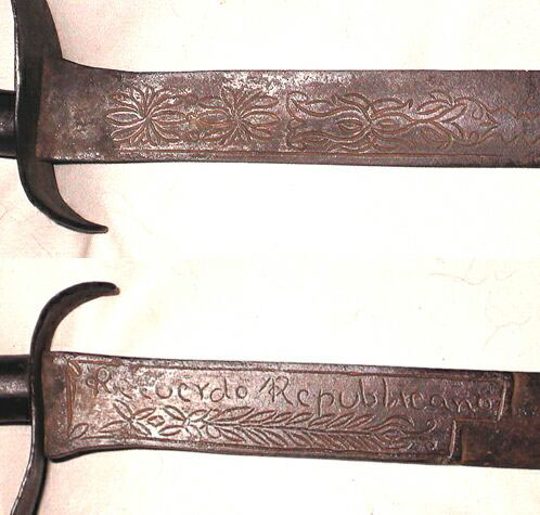 A few years back I posted pictures of a double-edged Spanish Colonial sword with the inscription "Recuerdo Republicano" (In Memory of the Republican) on the blade. That thread is here: http://www.vikingsword.com/ubb/Forum1/HTML/001235.html
