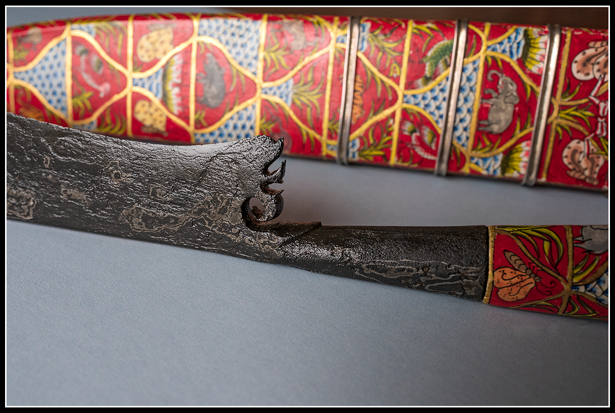 In the case of the Surakarta kraton, a wedhung can only carry pamor if it is worn by a prince, people of lower rank are not permitted to wear a wedhung that has pamor. I very much doubt that this wedhung has or ever had pamor. Dating this wedhung, blade only, would be very difficult if not impossible. There are a number of reasons for this. Pamor can be used as a guide in assisting to date any blade that carries pamor, but it cannot be done reliably from a photo. |