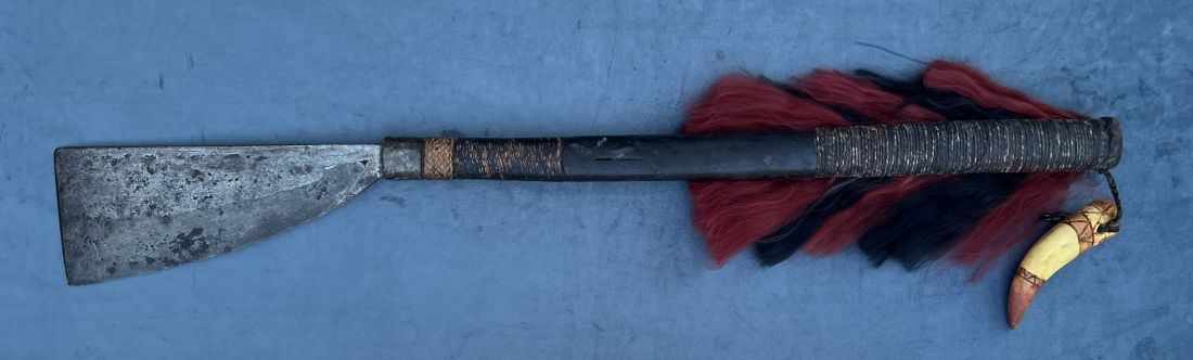 The axe seems likely to originate with the Konyak Naga based on the information I have. The shape of the blade is indicative as is the red and black hair. The ancestor figure carving I have not seen before nor is it mentioned in the references I have. It reminds me of carvings by the Paiwan (Taiwan aboriginals) on their weapons.