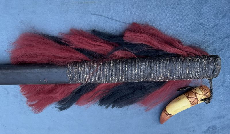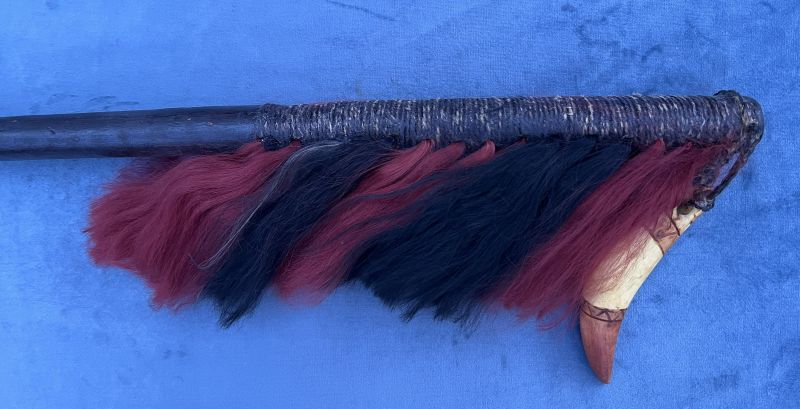 Yes, the seller gave information that the previous owner destroyed the hair because he was afraid of witchcraft . Apparently, he also made a leather braid. The fang was on the axe initially.