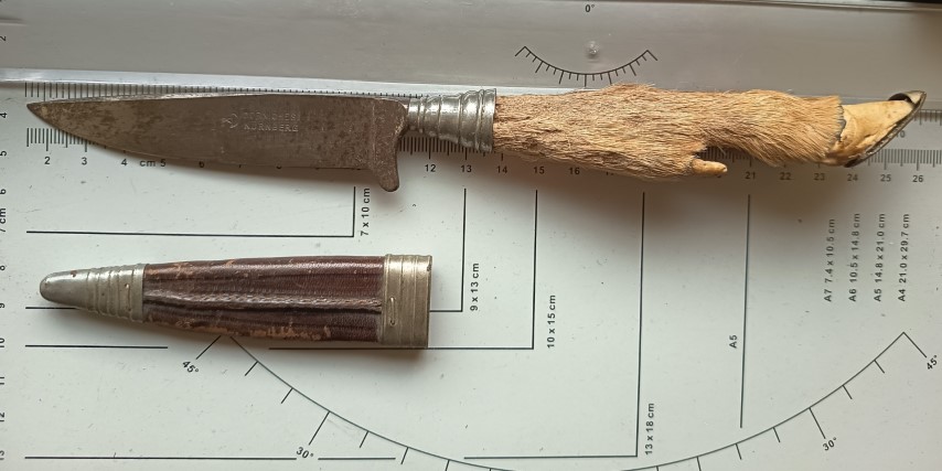 and the latest, which also seems most likely to me, is that it's a hunting knife "Jagdknicker", probably from eastern Germany or possibly western Central Europe, neo-Gothic style, 19th century around 1850-1860. I would like to confirm this identification.