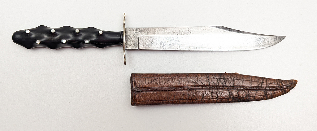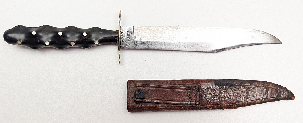 While obviously not an early example, and atypical to what is generally held as a 'Bowie', these typically are large blade, clipped point, cross guard, and usually a choil at blade edge root......in going through references there does seem to be suggestion this might indeed be in essence similar to the 'sandbar'. There is so much apocryphal lore about the Bowie knife itself and of course James Bowie who became a folk hero after the 1827 'Vidalia sandbar' fight near Natchez, Miss. that it has become virtually impossible to isolate fact from the abundant fiction. The most notorious proponent of the fanciful lore that is IMO worthy of Jules Verne was Raymond Thorpe,in his "Bowie Knife" (1949) and cannot even begin to touch the hyperbole here. One of the most comprehensive books loaded with fantastic illustrations is "The Bowie Knife" by the late Norm Flayderman, 2004. It seems that Jims brother Rezin had a knife for hunting apparently made by a blacksmith near his location in Avoyelles Parish in Louisiana. Jim had been in some trouble with a guy in some of their 'dealings' and he wanted him to have it for self defense. The opportunity came up in the famed sandbar duel in 1827, in which he came out victorious despite being badly wounded. His fame traveled fast, and some time later while recovering, he met a well known stage celebrity known for his theatrics, loud public quarrels, large custom made weapons often oversize for his performances...Edwin Forrest (1806-1872). Bowie sent him a knife, which Bowie said in a letter accompanying that THIS was the notorious knife the newspapers were so excited about, and thought he might like to add it to his collection. According to Bernard Levine, in his "Knives and Their Values, 4th Ed." 1985, p,320, he notes this knife does not seem professionally made, and suggests he is satisfied with its authenticity. While this goes to the 'Sandbar' knife, the fabled knife from the Alamo is yet another mystery!! In the pics note the 'butcher knife' like knife said to have been Bowies at the Sandbar fight. Then look at the Gilliam/Noble version early Bowie, no guard. the panel of examples is from Robert Abels collection c. 1960s. Note #5 which is open hilt style Bowie hunting knife, Seattle c. 1900. In a most esoteric article in the now defunct "Arms Gazette" (March 1977) "The Spanish Notch" by W.R.Williamson; it describes the curious notch (choil) at the base of the blade edge on the knives of this general shape (butcher knife etc) known as Meditteranean or Spanish dirks. These were prevalent with sailors on vessels and it has never been entirely explained what these were for. The author notes a news ad from the 'MEXICAN CITIZEN", Feb. 12,1833, in San Felipe de Austin, Texas that a shipment of cutlery from Collins & Co. had been received by merchant Lewis Veeder including hatchets, butcher knives, pen knives and Spanish dirks. This was of course the center where James Bowie, Stephen Austin, William Travis were situated, of course three years prior to the Alamo. interestingly, Sheffield had been supplying knives to US even before 1812, and by 1826 the first full fledged factory completed (William Greaves & Son) and the early Bowie trade began shortly after the Sandbar. Even the well known Wostenholm , Rockingham Works was producing the I*XL knives by 1830. (Levine op. cit p.323). My example, Mexican Bowie......hilt of chiollo cactus, found in Tucson years ago, probably from late 40s to 50s. Last edited by Jim McDougall; 3rd May 2025 at 10:31 PM. |