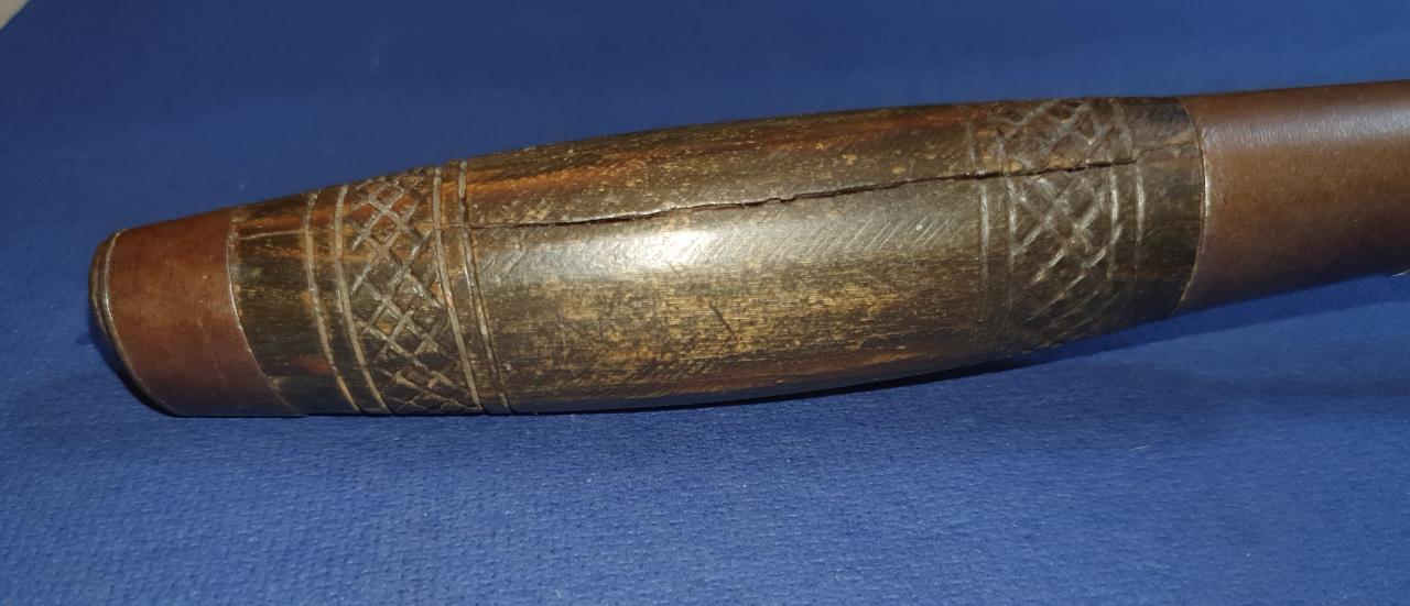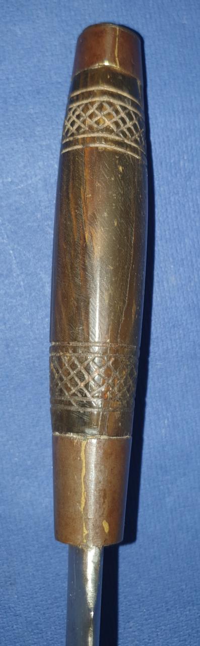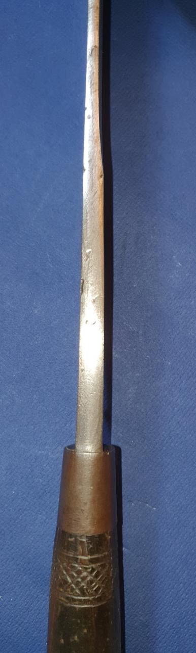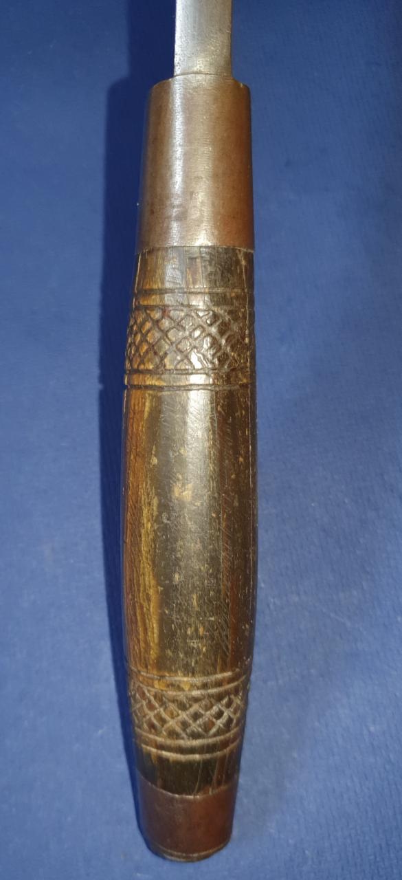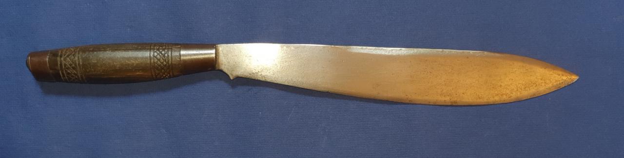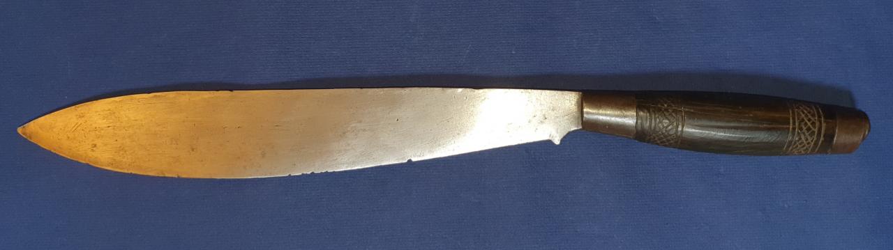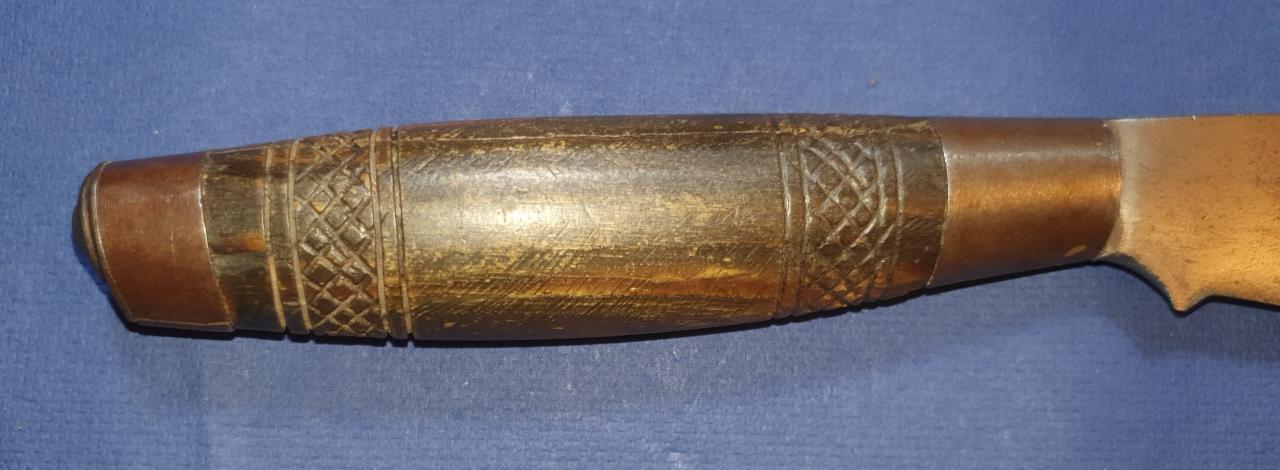 It seems to had a hard life behind it, the edge shows several nicks and the spine seems to be heavy treated in the past.