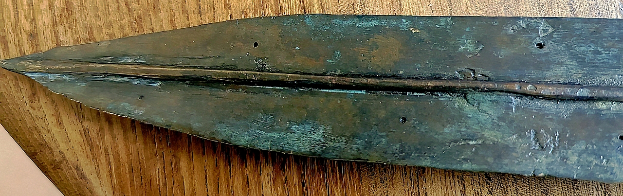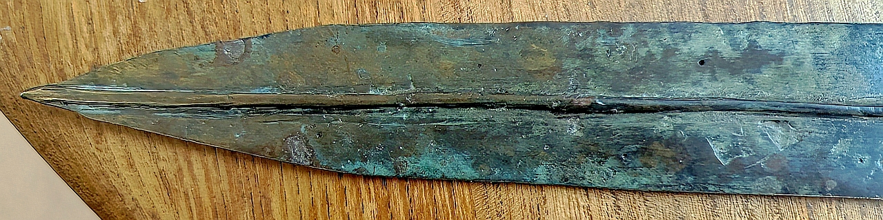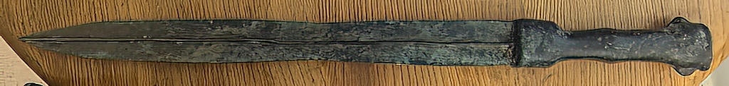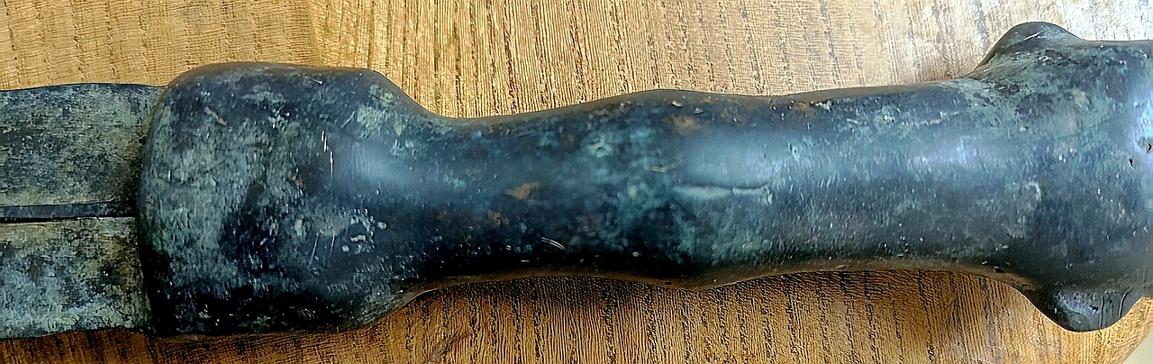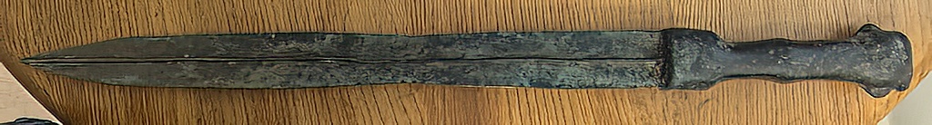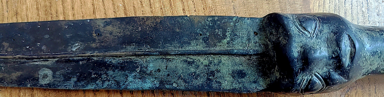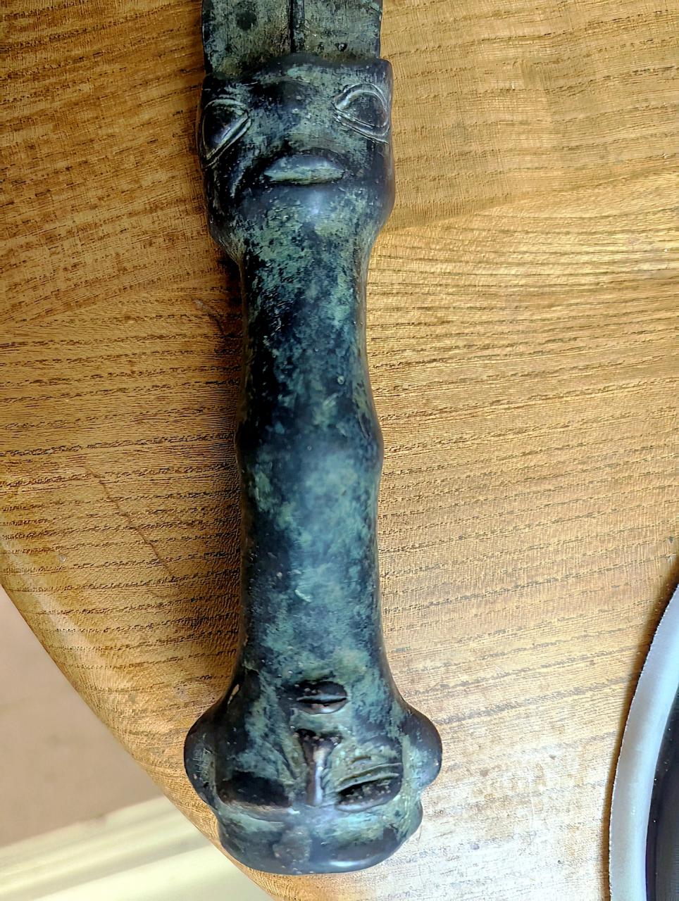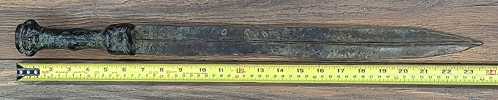 Acquired this recently, described as a Luristan bronze sword. It has a grip with a face on the pommel and on the bolster. Fairly thin, prominant raised central rib, not sharp.