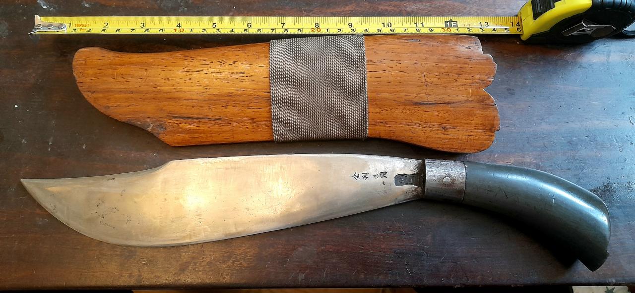 that blade is way smooth and nicely ground and struck to nicely to be a cheap Chinese imported item. i see the rivet in the bolster. its odd. you see thai items from the 60s onward with these pins in the bolster to hold the blade in, but its not a historical thing.... .. its just people forgot how to attach the handles precisely by burning and resin and began putting ins and glue.. you can see the pins in the bolsters appear in java in indonesia in the 80s too for the same reason- decline in skill in fitting the handles... but this knife looks older than that. the die is a factory made and crisp, a hot stamp die- there is also a logo. the blade is a weird shape.. and not of any known style i recognise., the handle is like Meo and cambodian and some thai knives. i have seen pre war japanese knives/machetes made to export to guam/carolineislands.. kiribas.. and also some to the philippines and thailand with japanese characters on them but these were all replicas of local knife types that the japanese traders (naval intel officers) opperating as merchants were offering to the locals along with other japanese wears made for the local market.. these traders were widespread in asia till the end of ww2 and gathered a great deal of intel and info about local ethnic groups in regions they operated in and offered japanese goods tailored to the local market, those japanese factory made "bolos" do have japanese text on the blades. this knife has an exotic look , the fact the bolster is pinned makes me think japan too. malays goofing up and pinning bolsters? no at least not until very very recently. can we have more pictures.. the butt of the knife the scabbard the knife in the scabbard, thickness of the blade and so on. im guessing japanese made.. for the thai market pre ww2. |